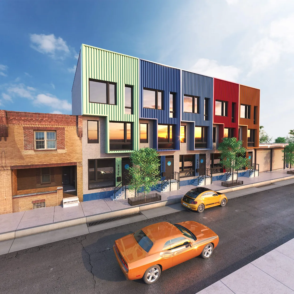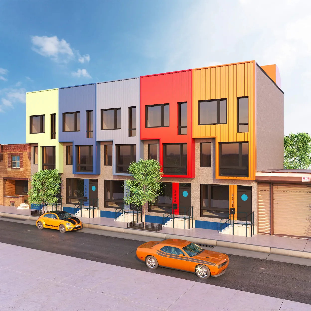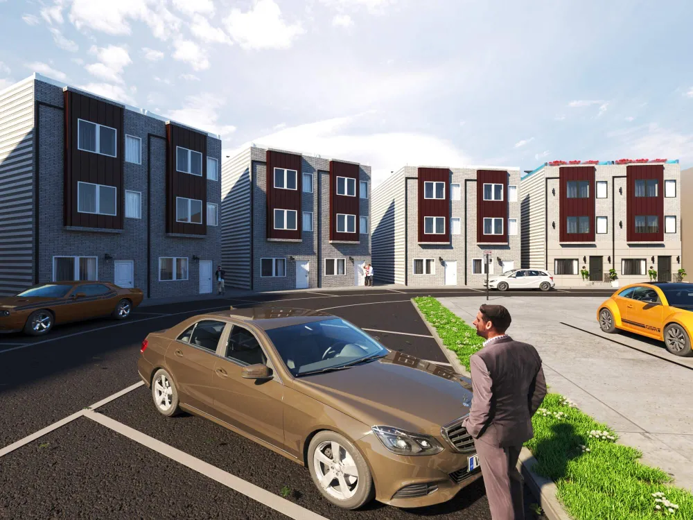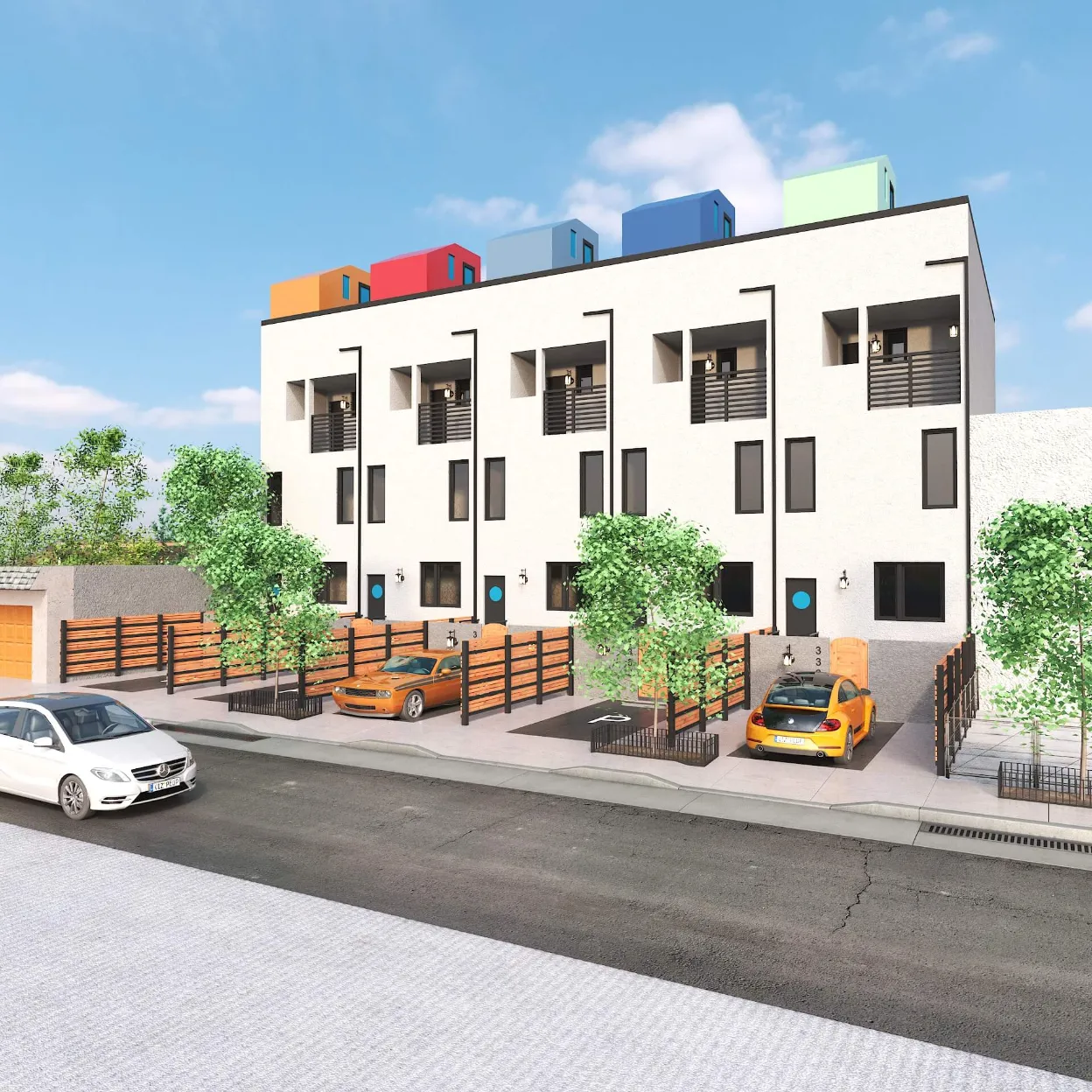 Colorful multi-unit townhouse concept blending functionality with bold design. Distinct facades create individuality, while shared architecture keeps harmony and rhythm.