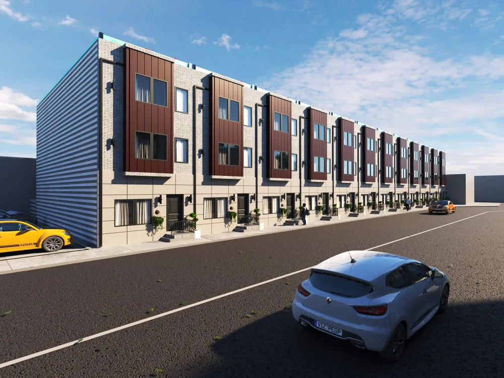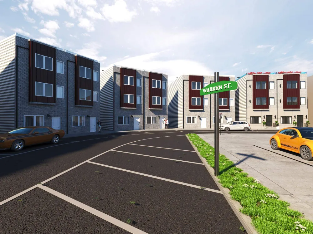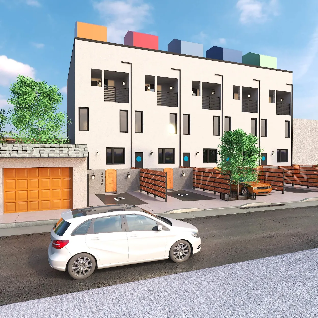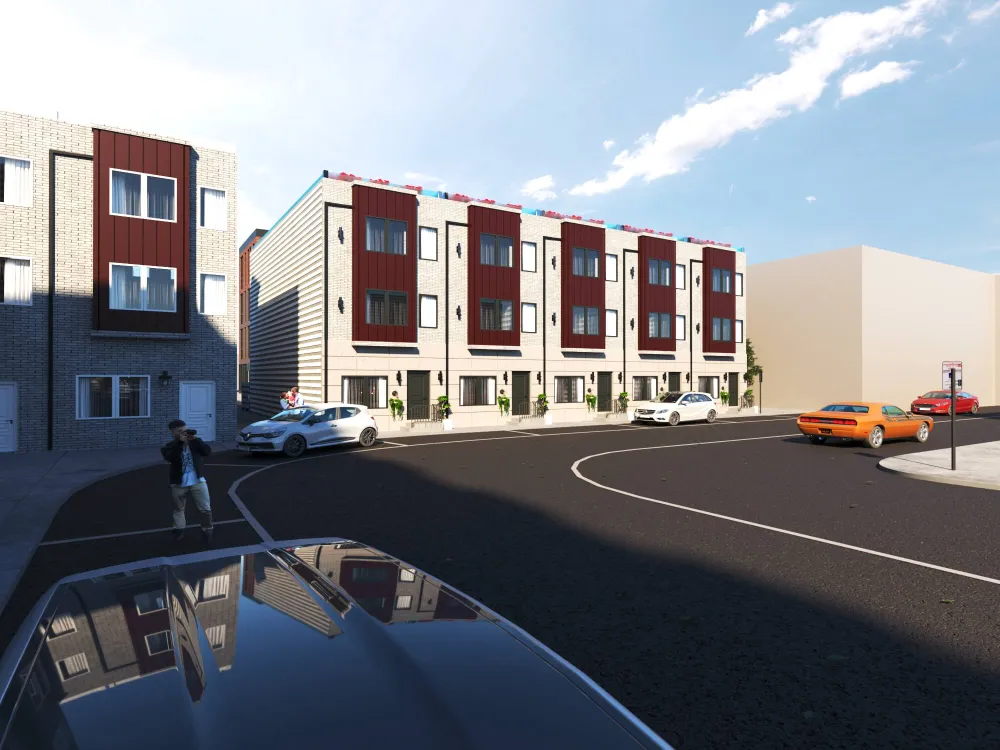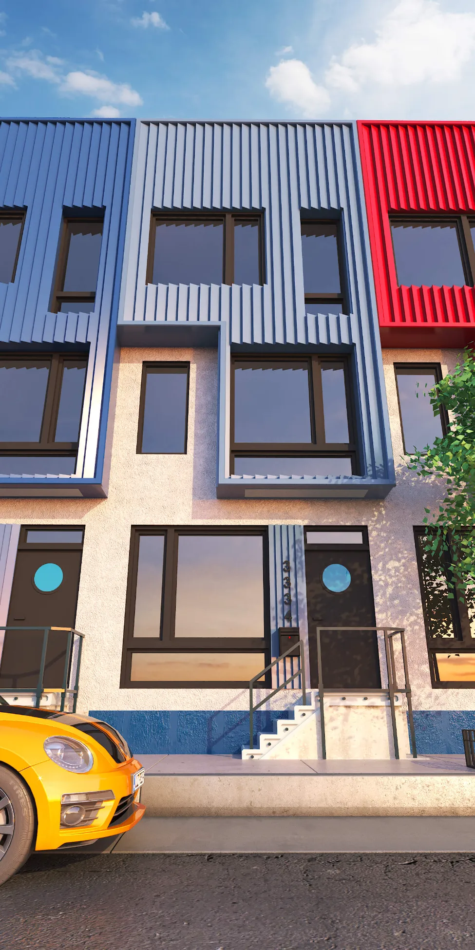 Colorful multi-unit townhouse concept blending functionality with bold design. Distinct facades create individuality, while shared architecture keeps harmony and rhythm.