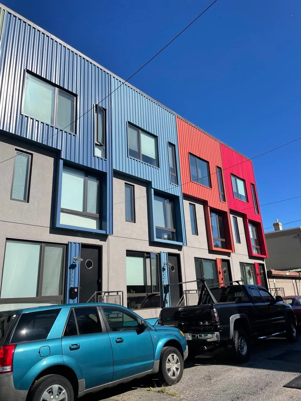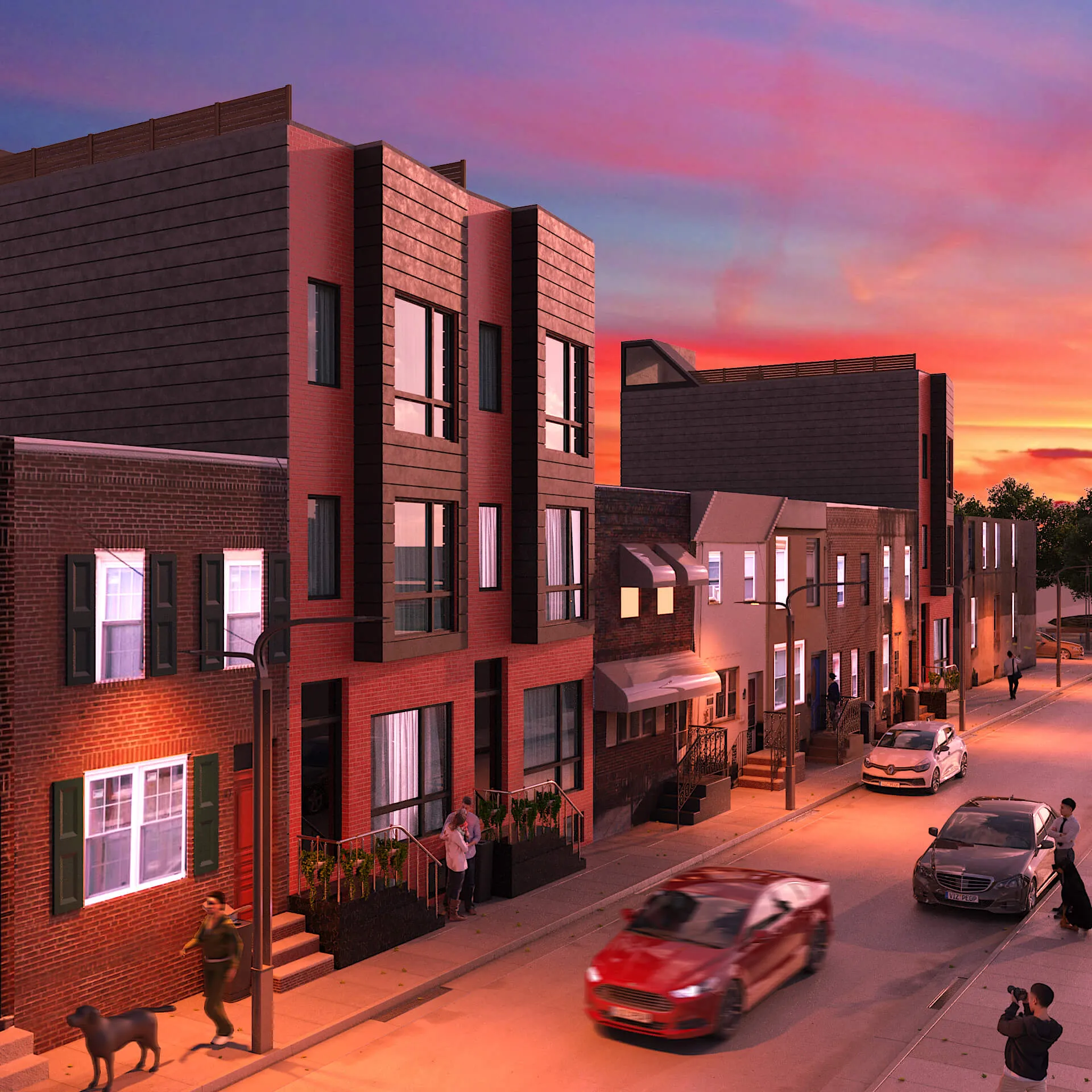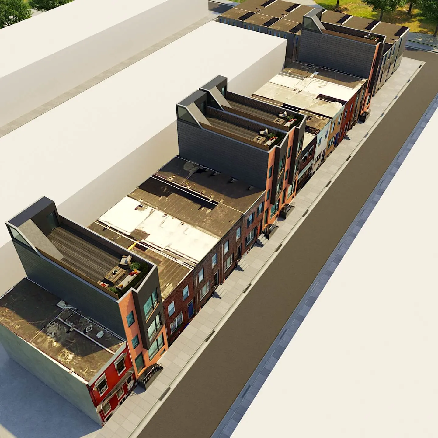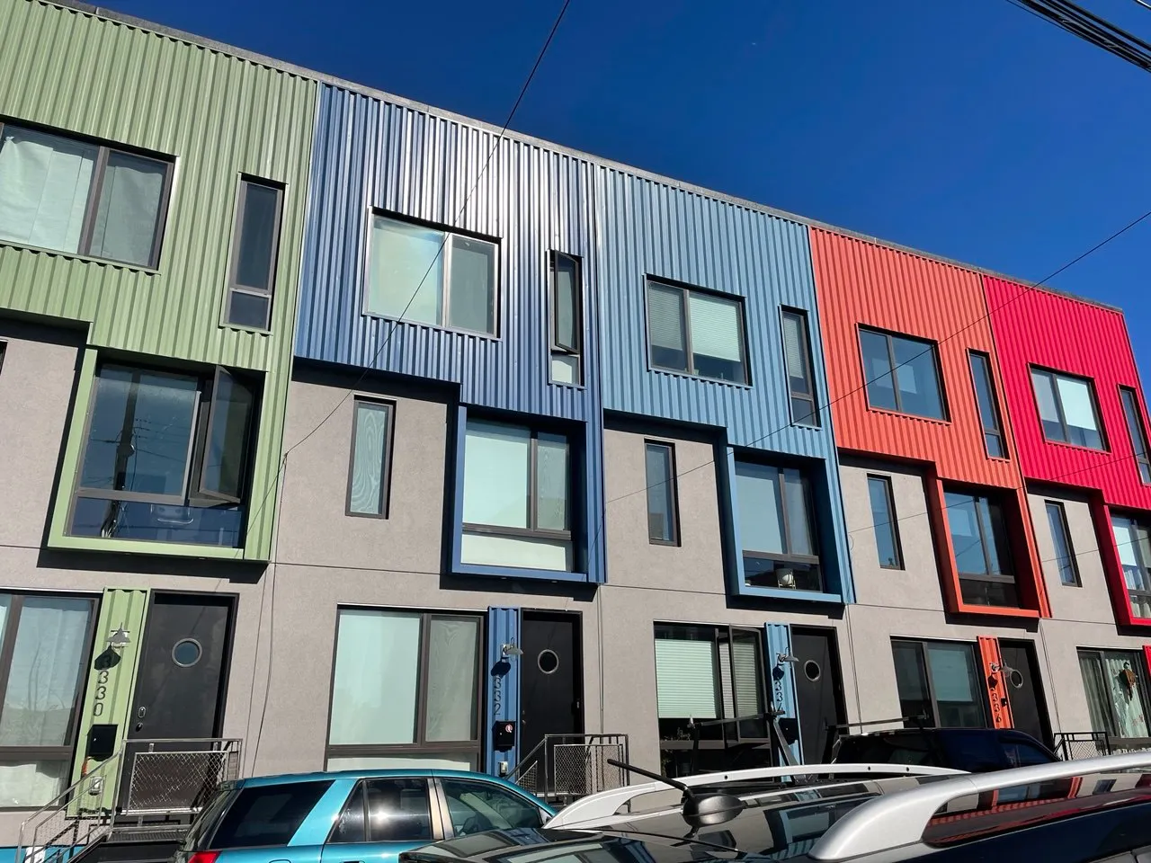 Colorful multi-unit townhouse concept blending functionality with bold design. Distinct facades create individuality, while shared architecture keeps harmony and rhythm.