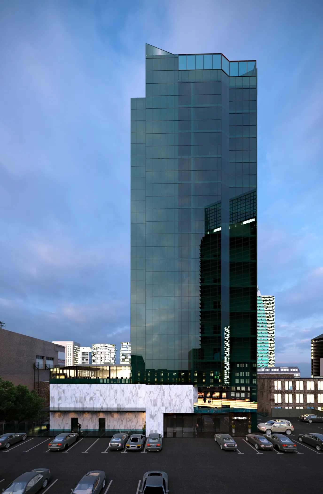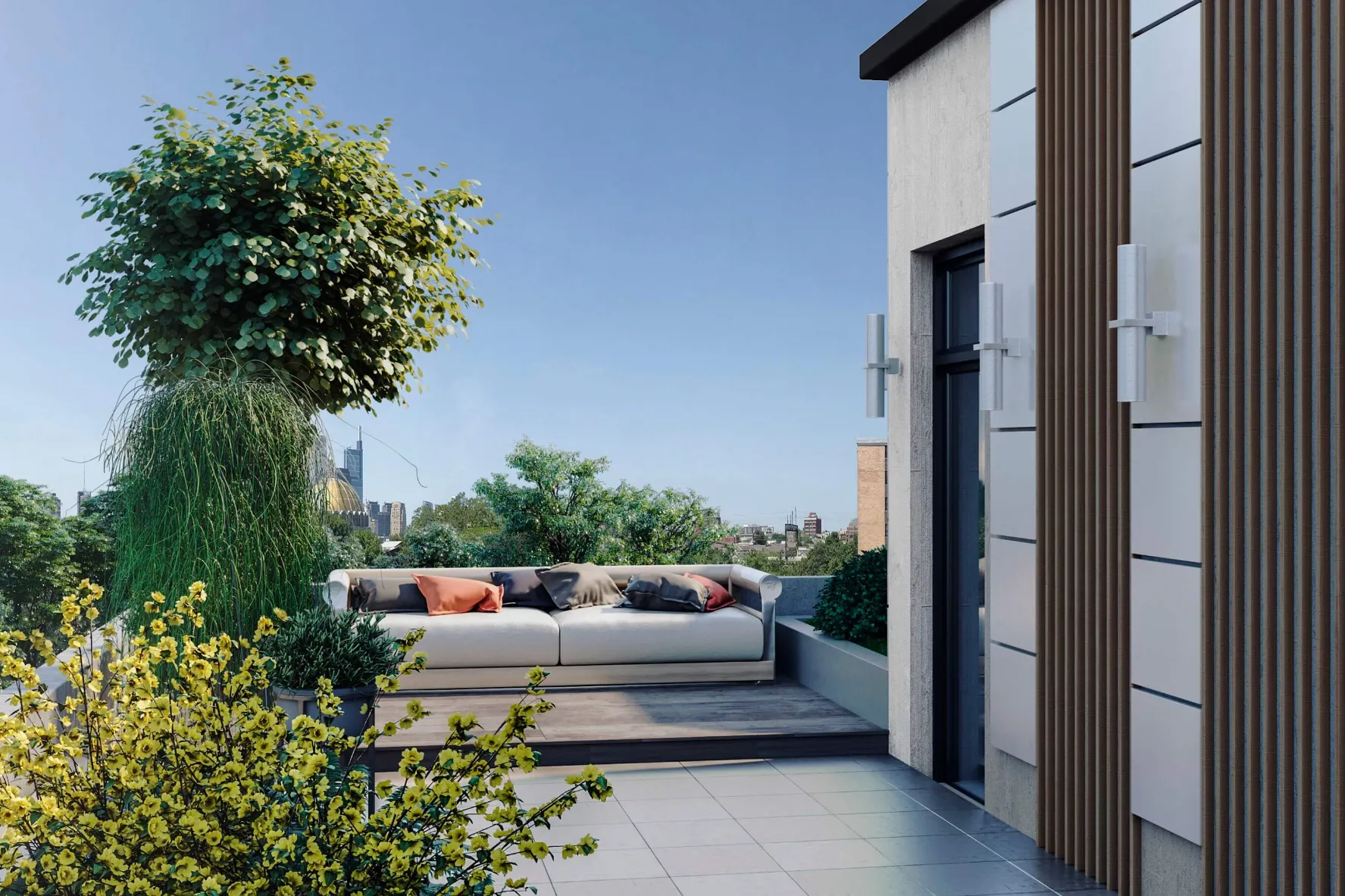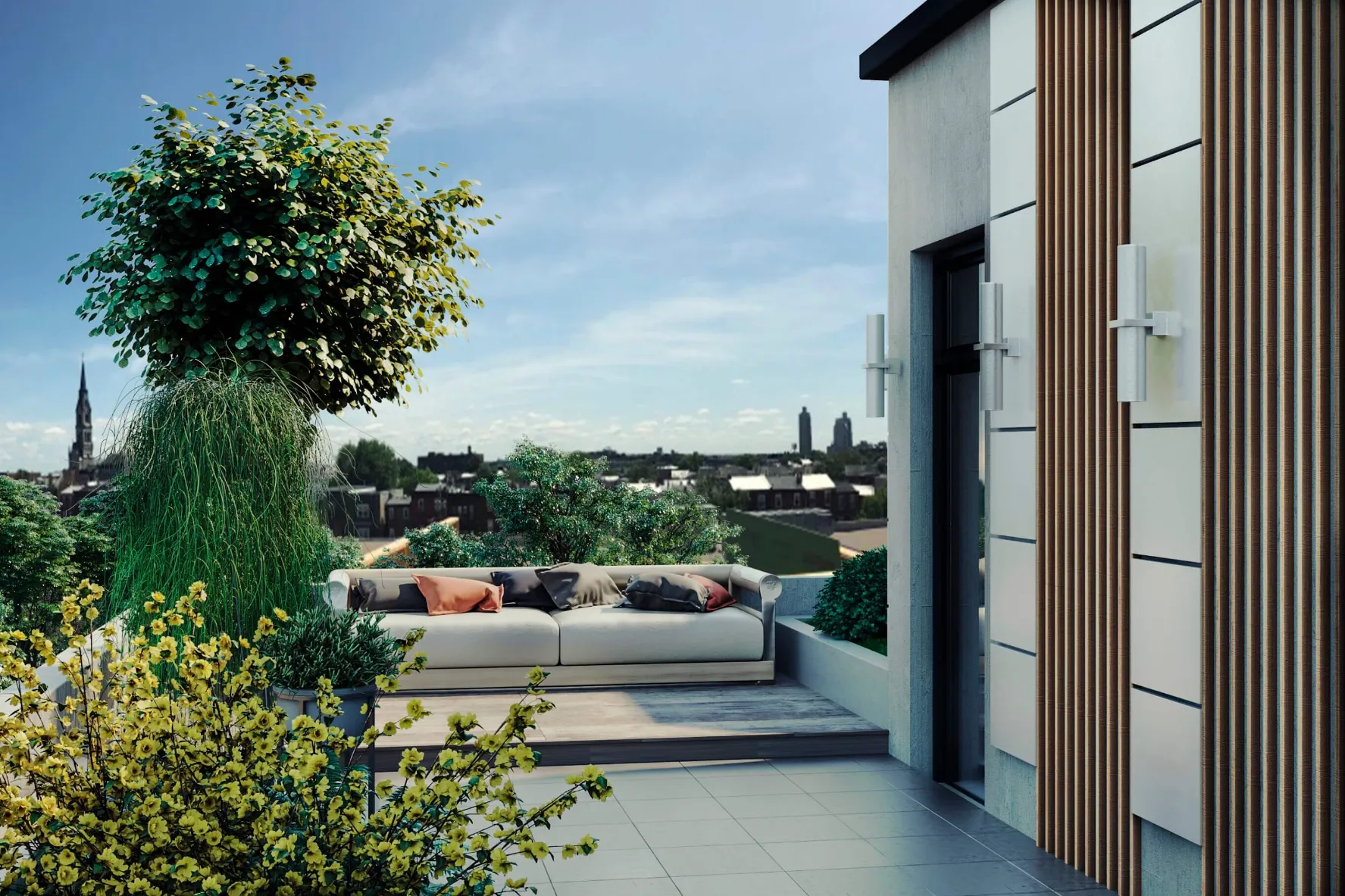 Contemporary residential complex with clean lines and light urban aesthetics. Spacious terraces, private parking, and landscaped surroundings.