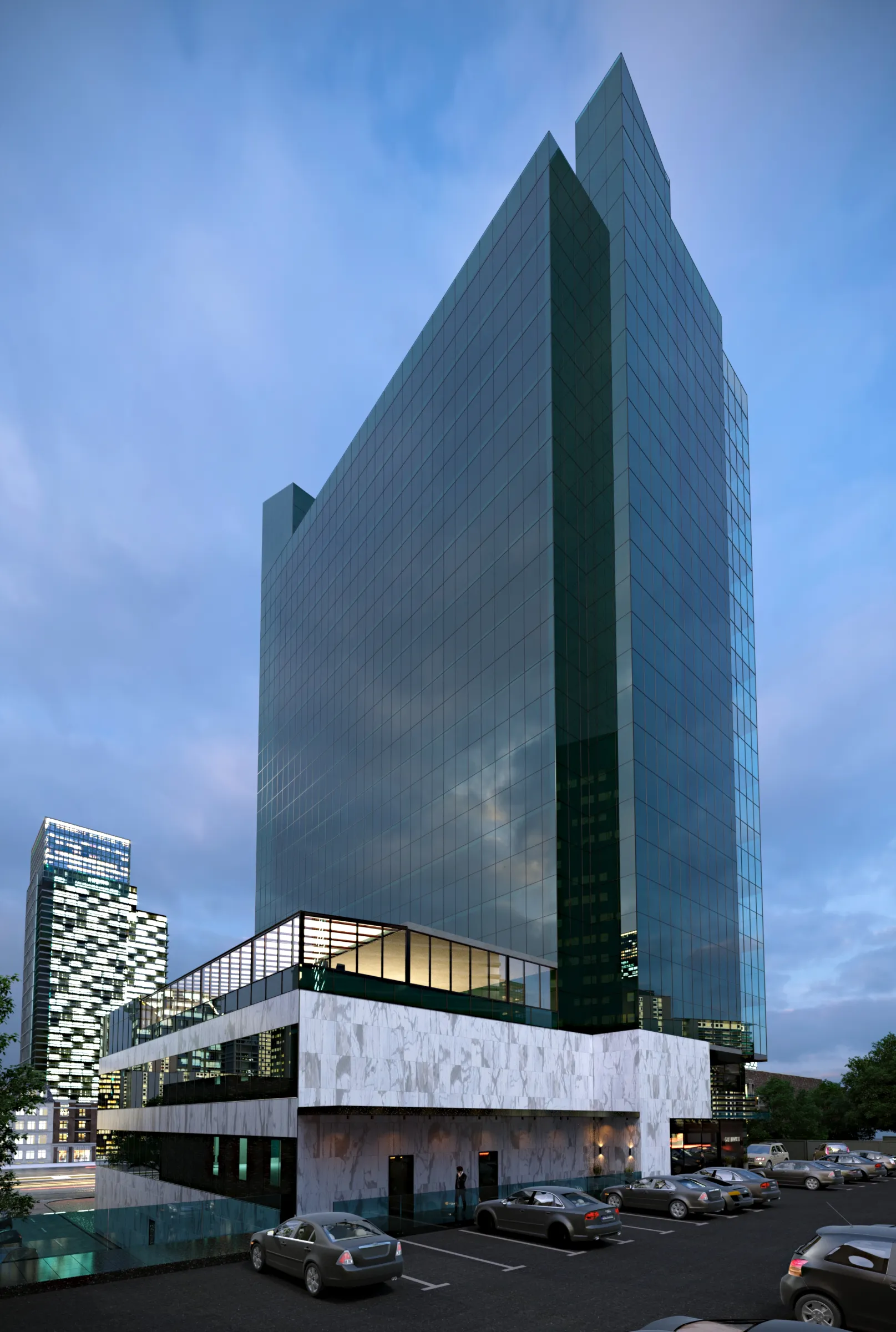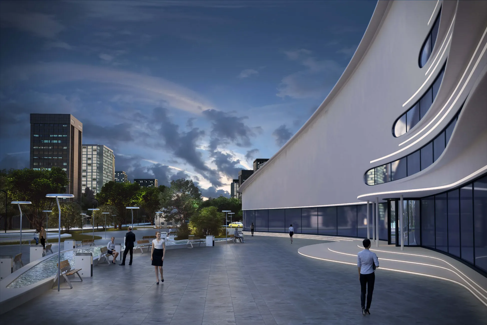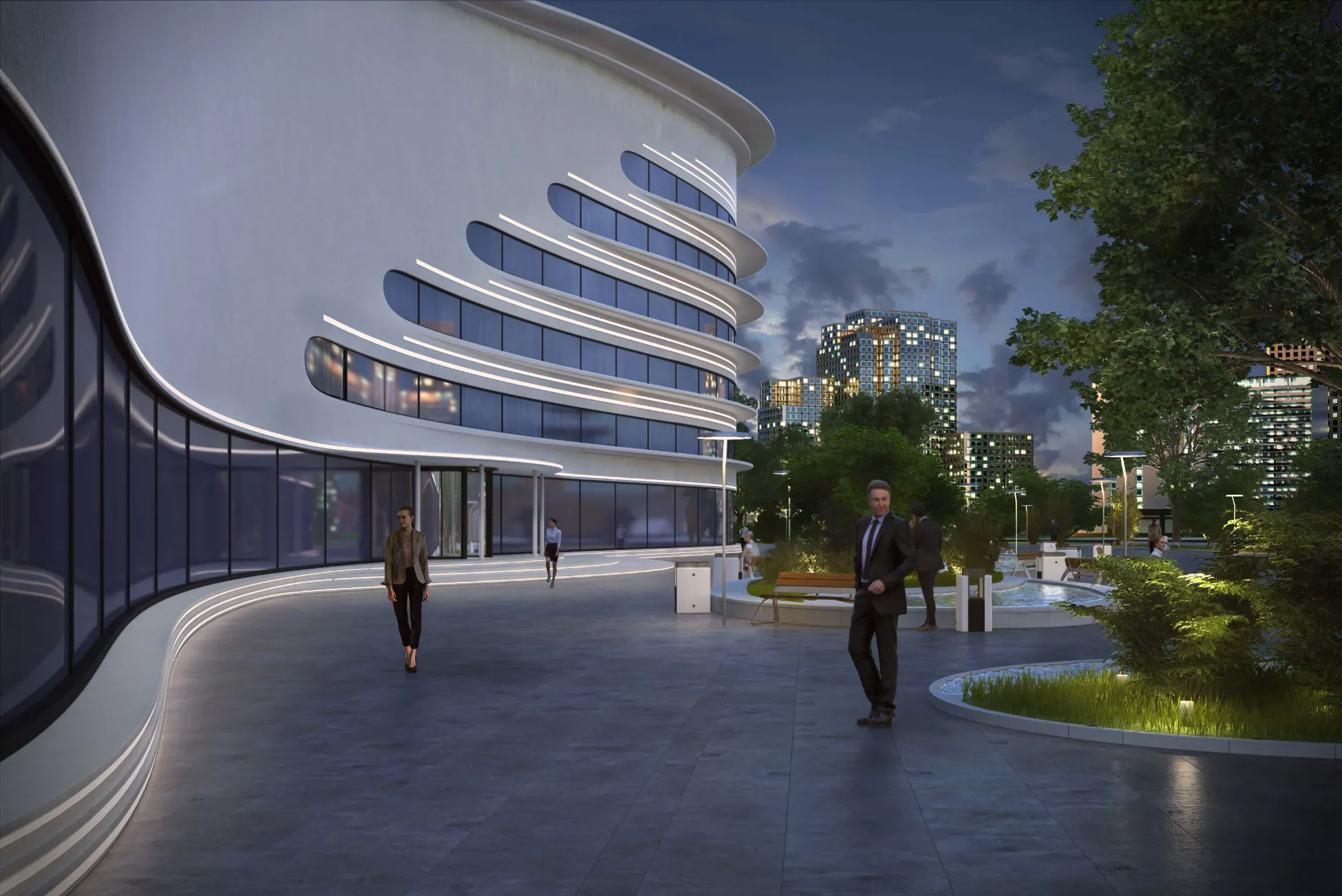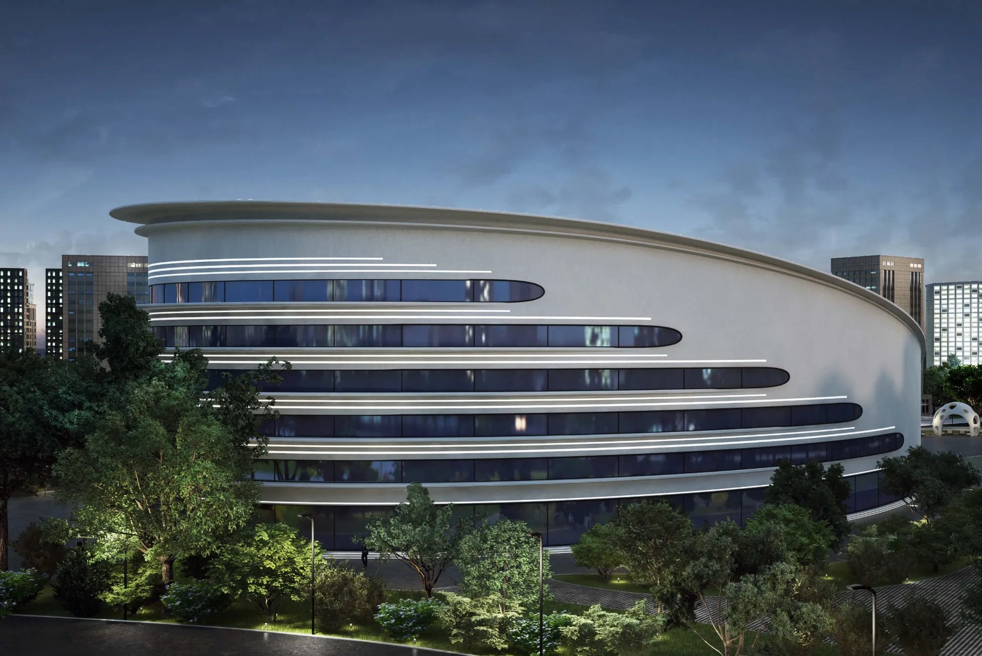 A futuristic architectural concept inspired by organic, flowing forms. Smooth curving lines and panoramic glazing create a dynamic, fluid building silhouette.