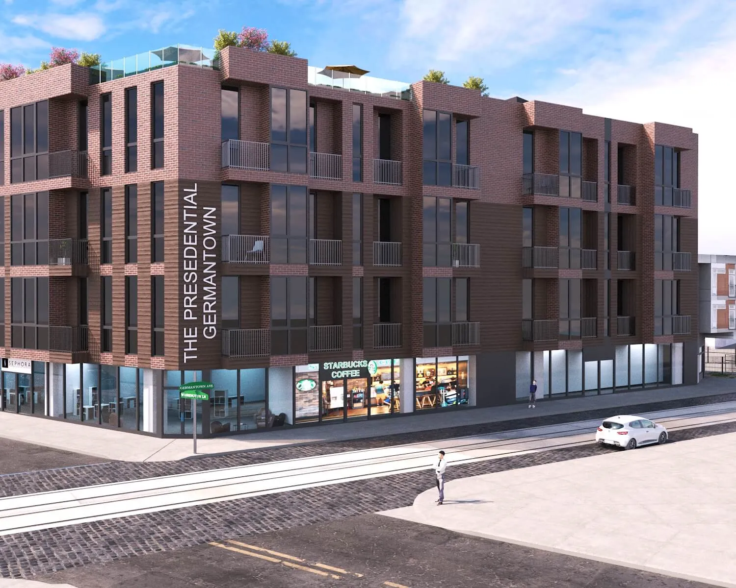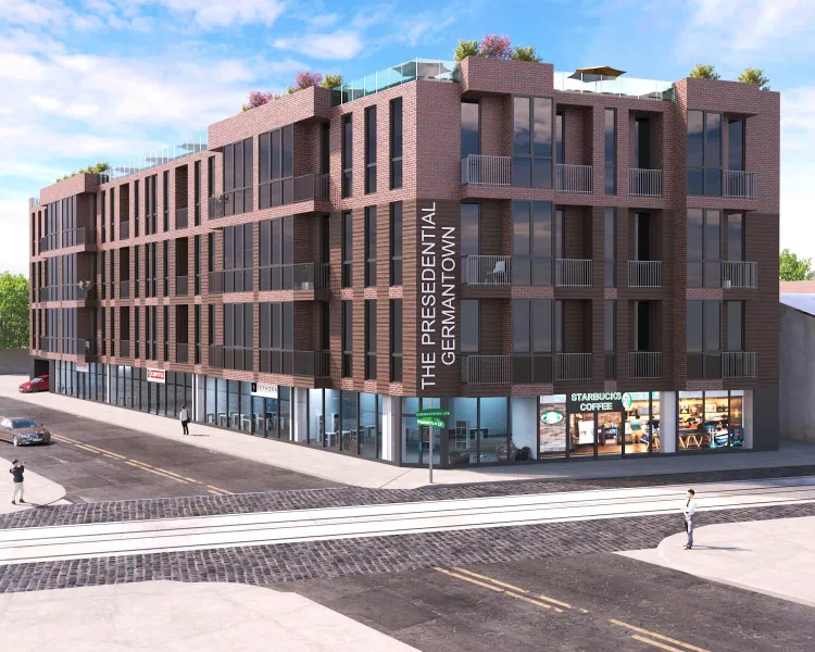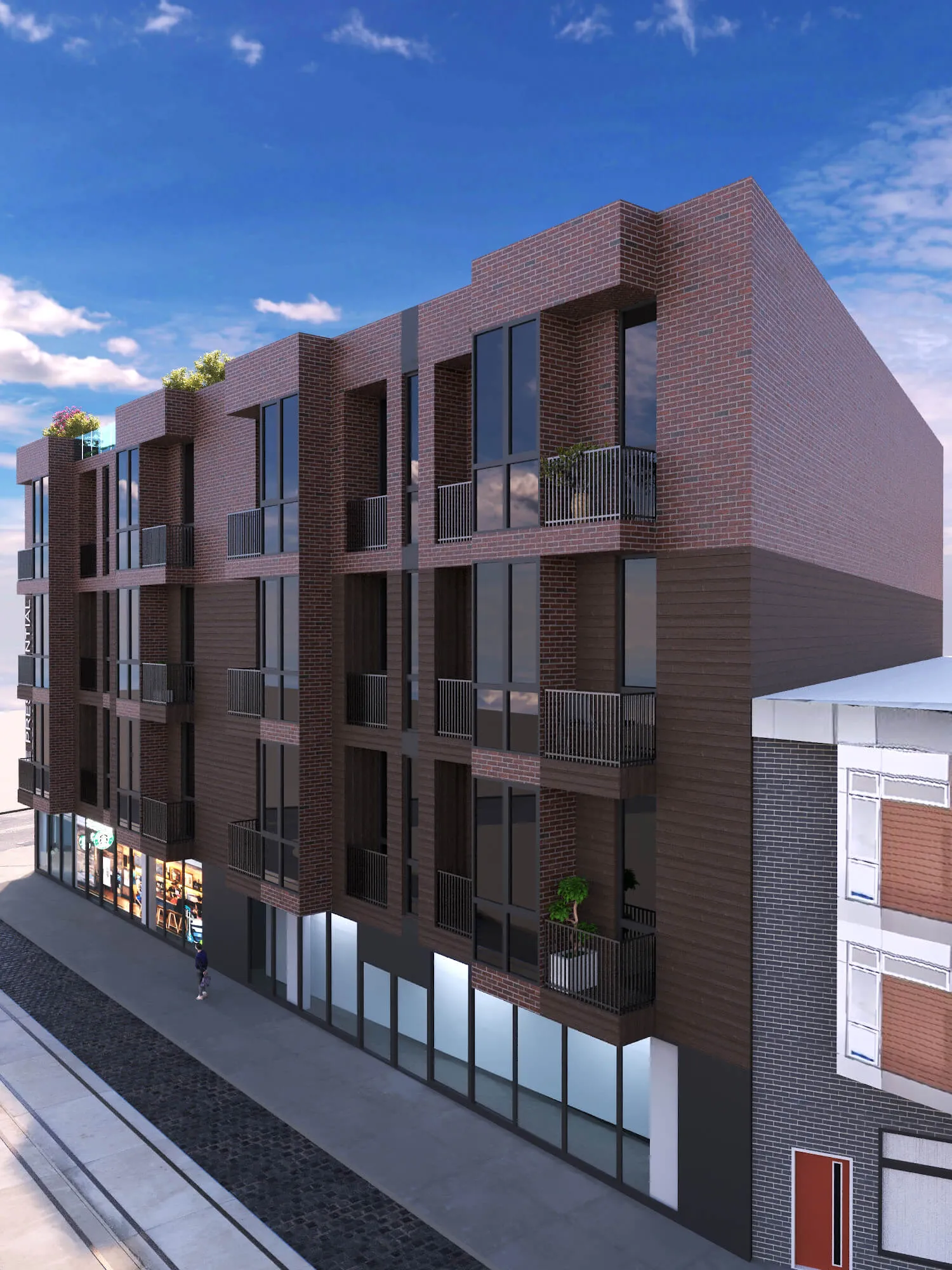 Contemporary housing and commercial development with clean lines and rhythmic facades. Thoughtful integration of green roofs and open areas enhances comfort and sustainability.