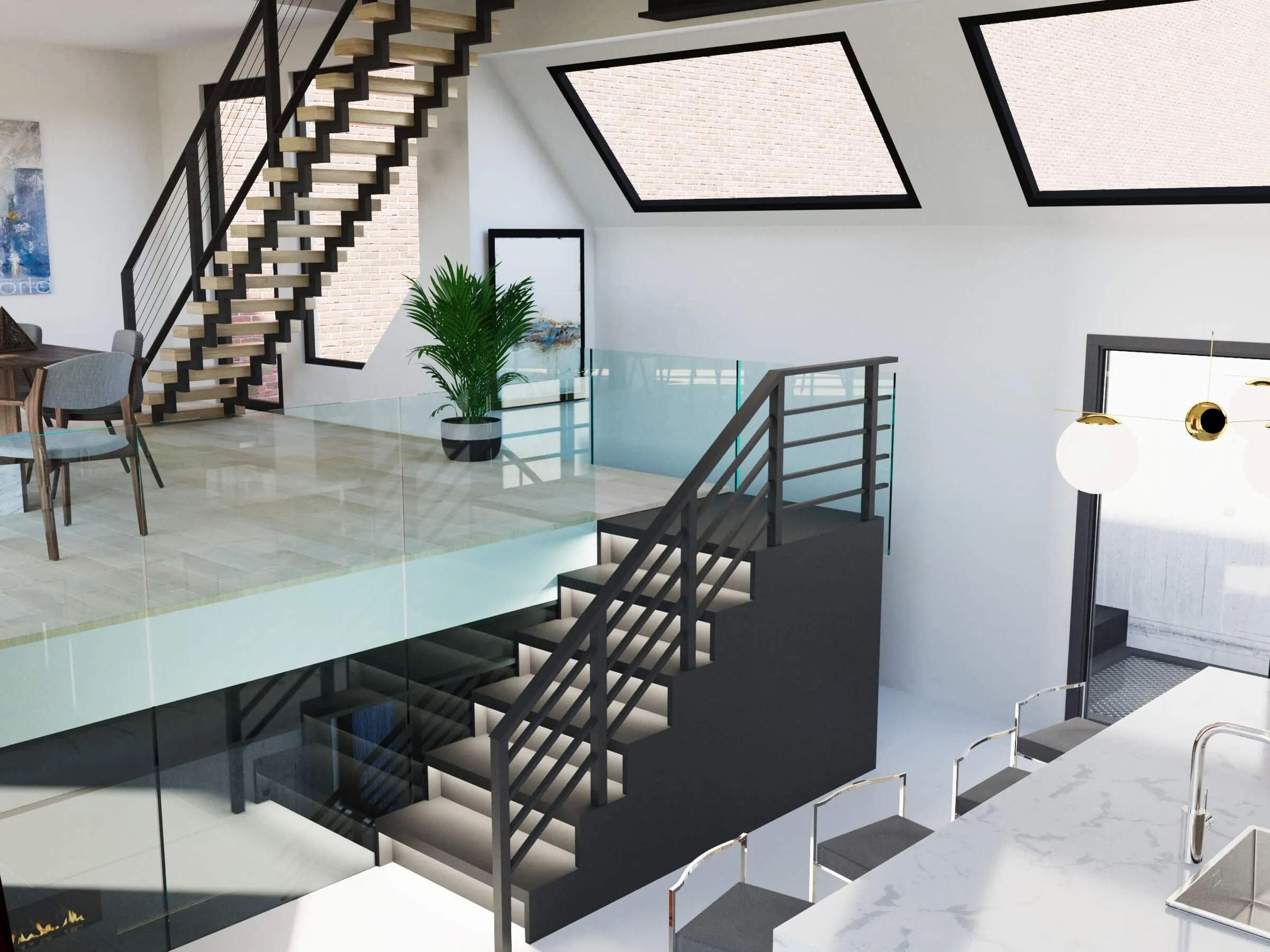 Modern extension and interior redesign of a classic brick townhouse. Contemporary volume added to create more light, space, and vertical living comfort.