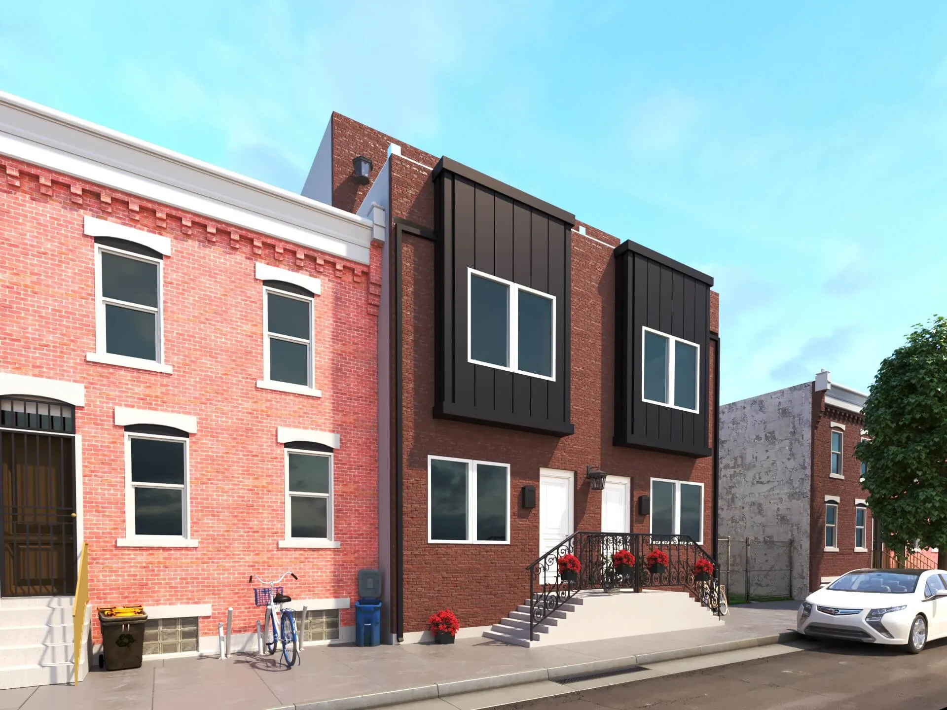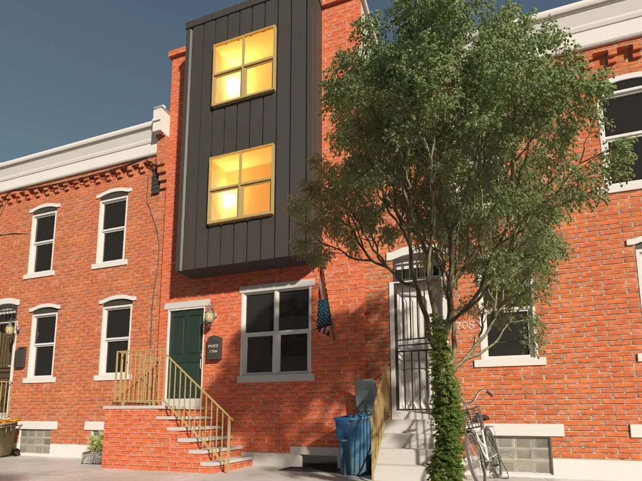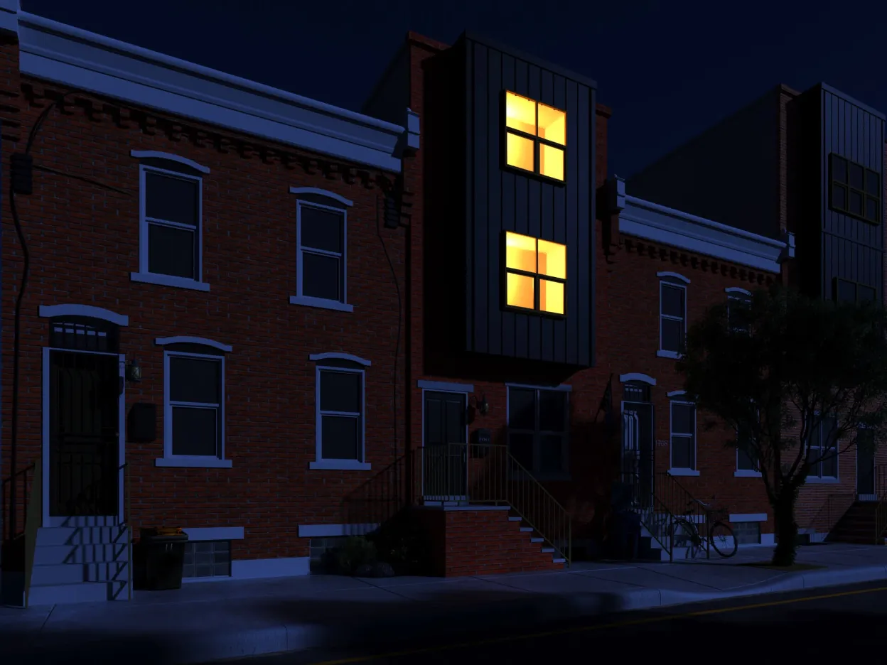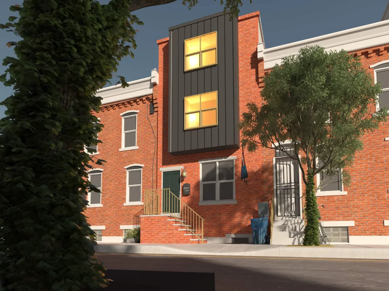 Stylish urban residence combining traditional brick textures with modern metal forms. Expansive roof deck and airy interiors maximize comfort in a compact footprint.