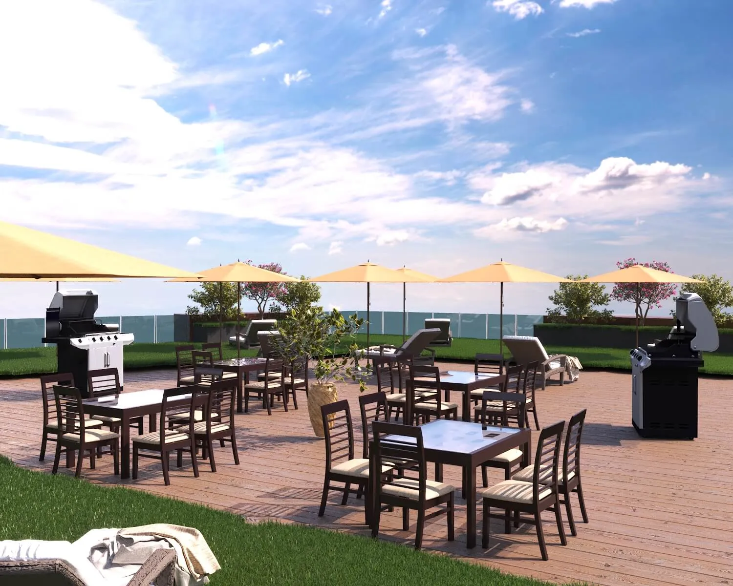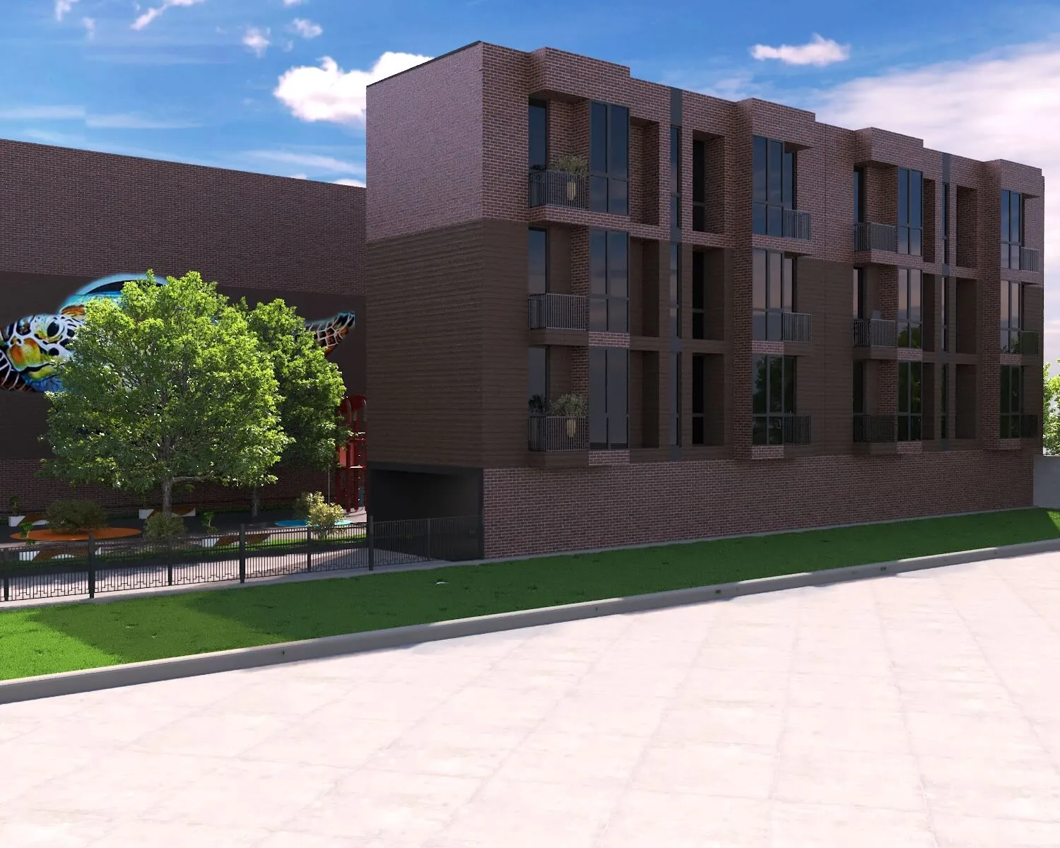Contemporary apartment development with outdoor lounges, green spaces, and family-friendly amenities integrated into urban living.