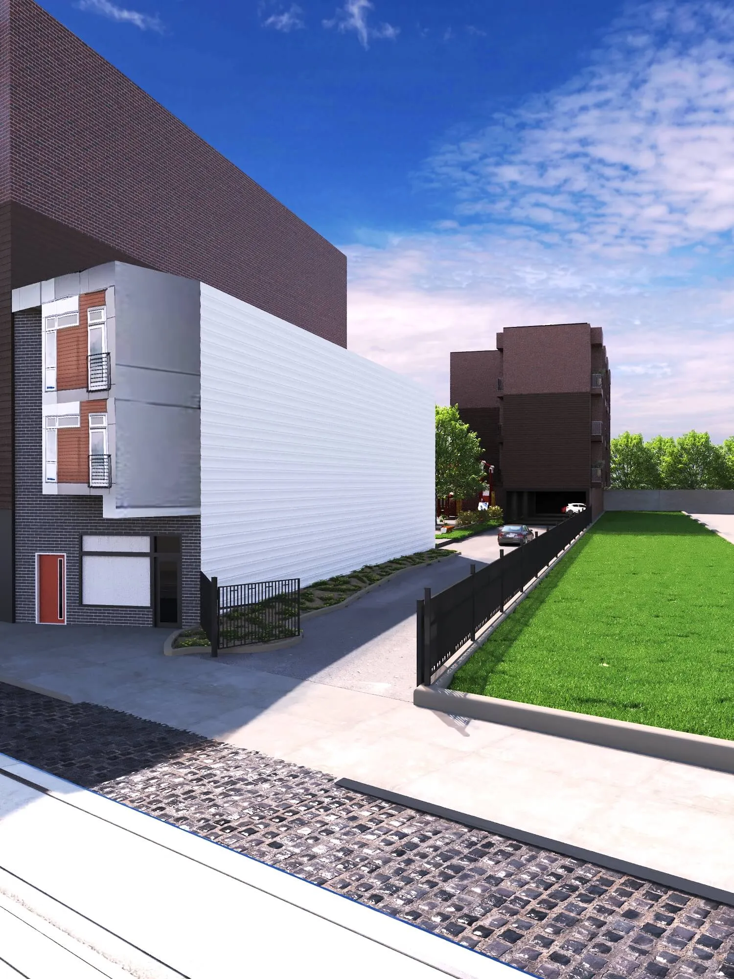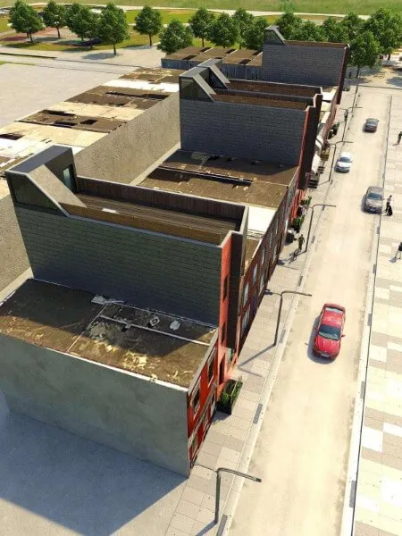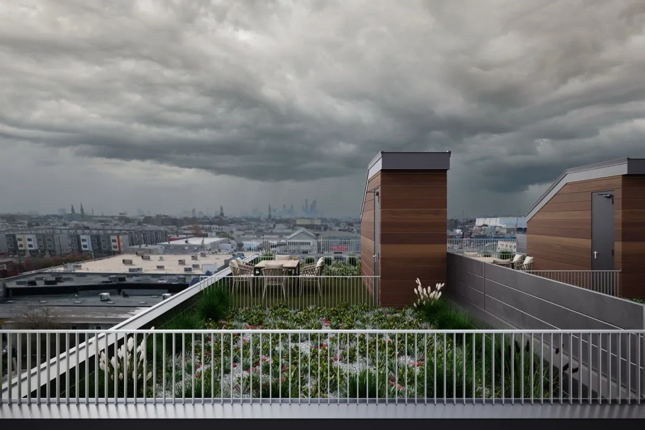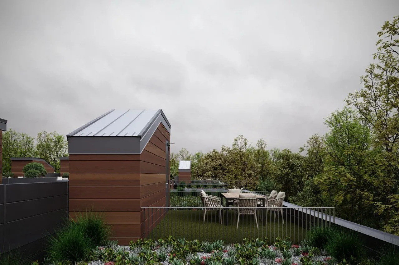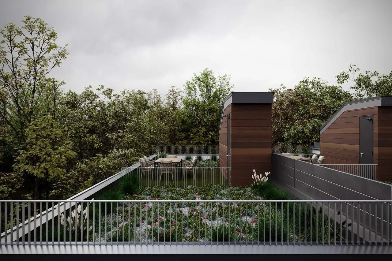 Contemporary housing and commercial development with clean lines and rhythmic facades. Thoughtful integration of green roofs and open areas enhances comfort and sustainability.