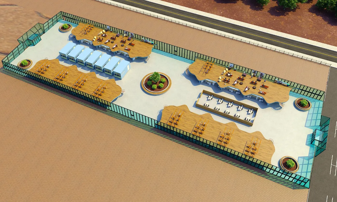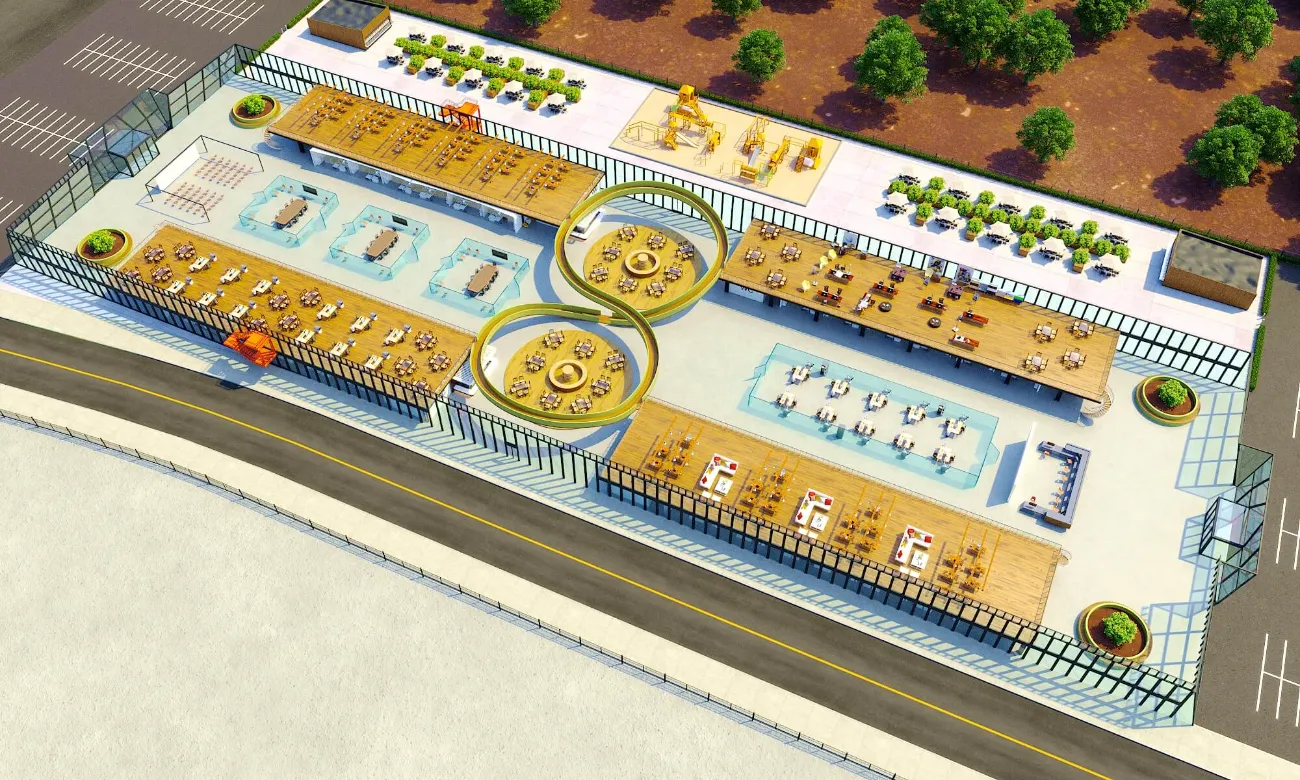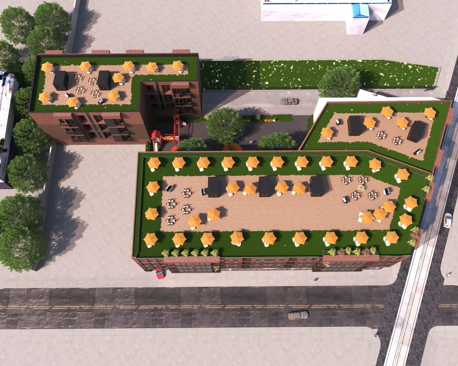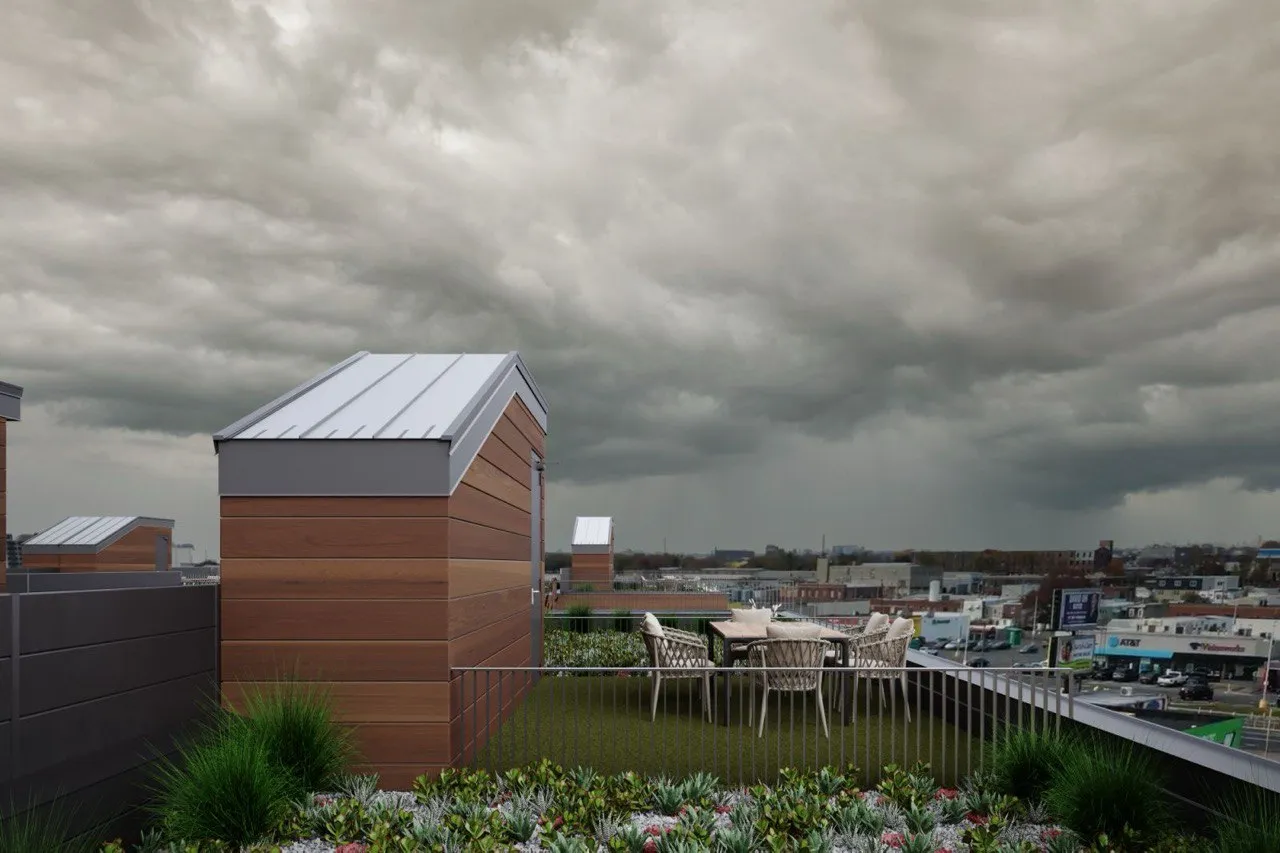 Contemporary housing and commercial development with clean lines and rhythmic facades. Thoughtful integration of green roofs and open areas enhances comfort and sustainability.
