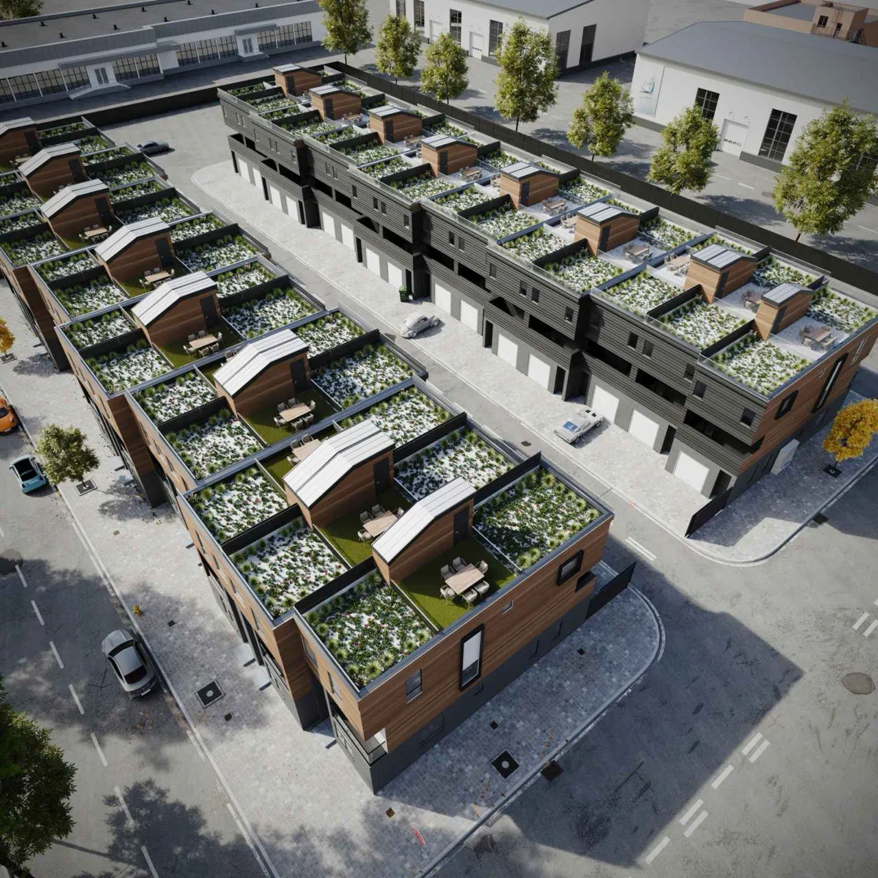Compact modern housing concept with green roofs and shared outdoor areas. Smart architectural rhythm, minimalist form, and harmonious integration with surrounding environment.