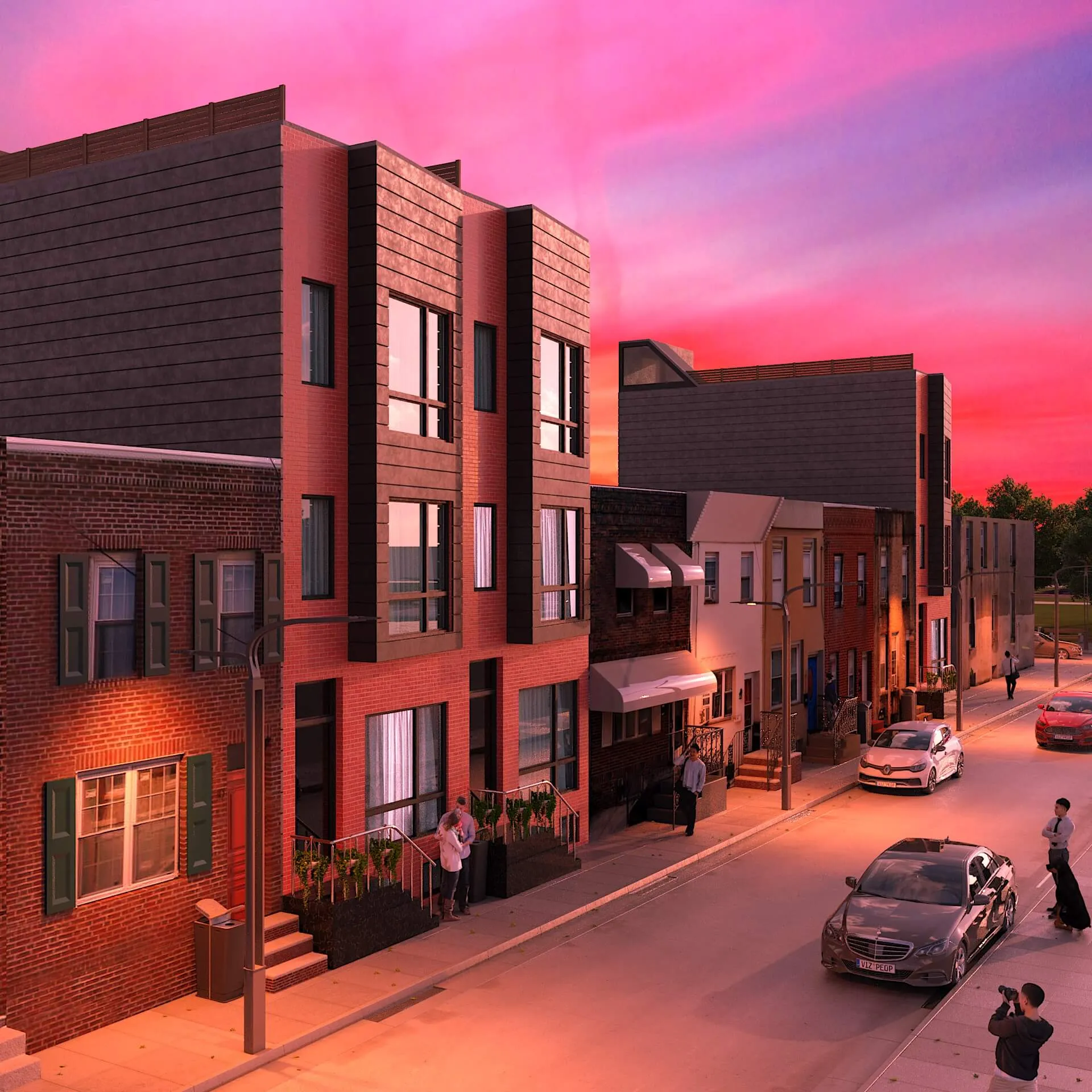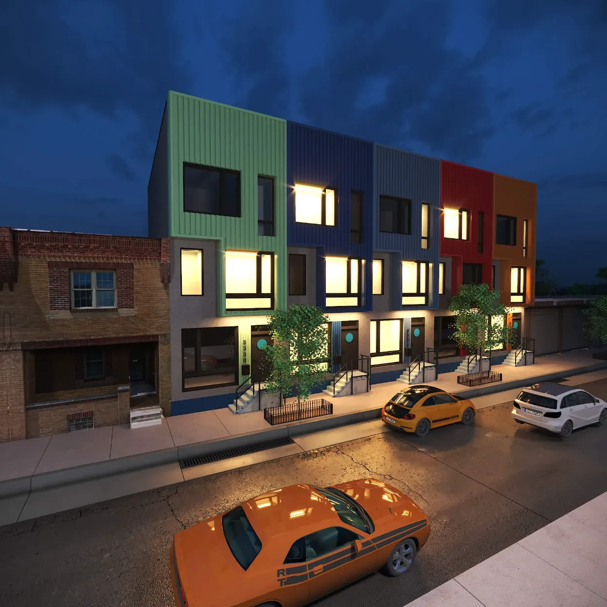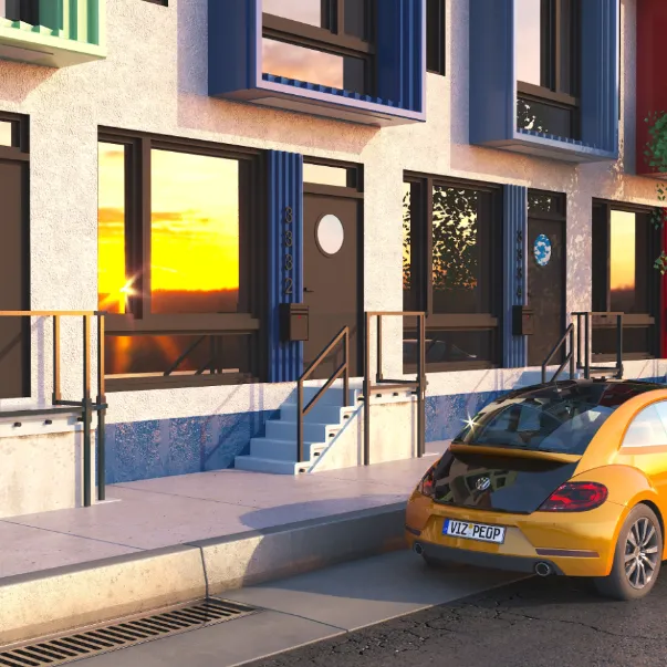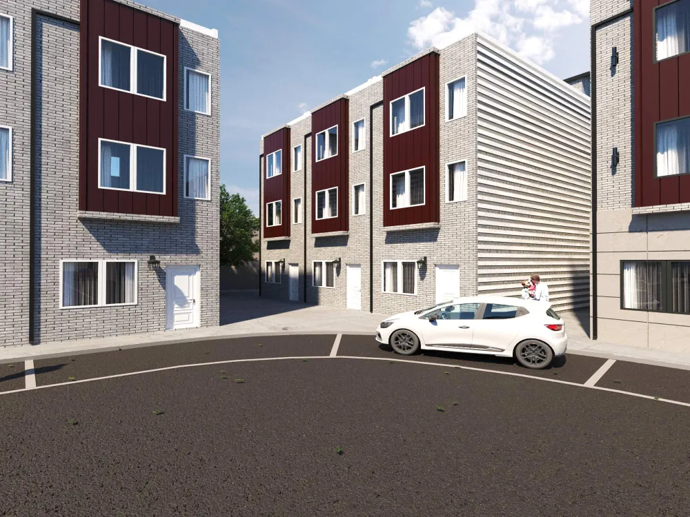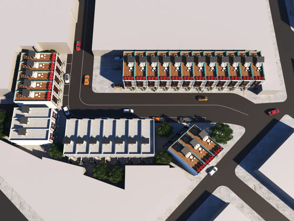 Colorful multi-unit townhouse concept blending functionality with bold design. Distinct facades create individuality, while shared architecture keeps harmony and rhythm.