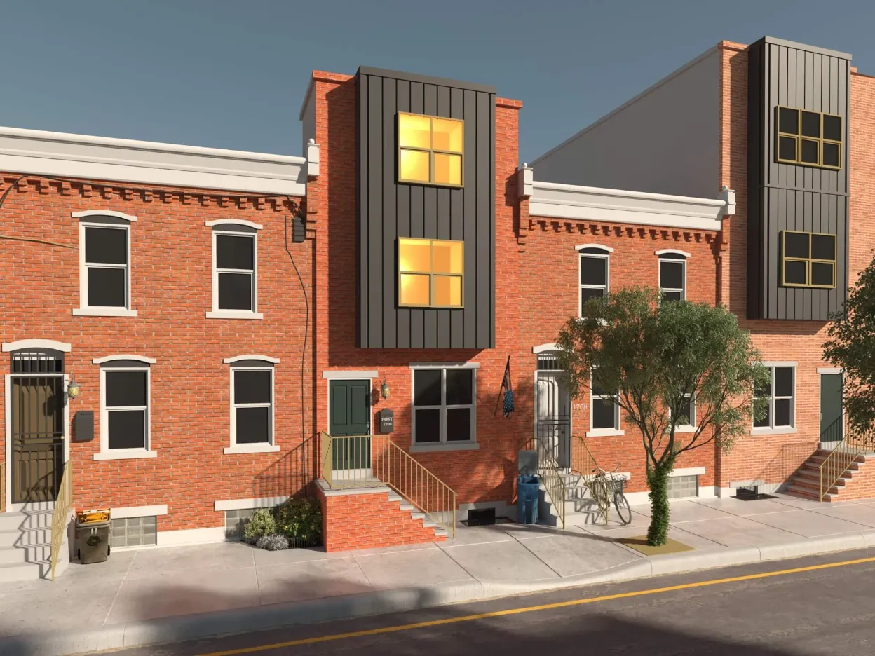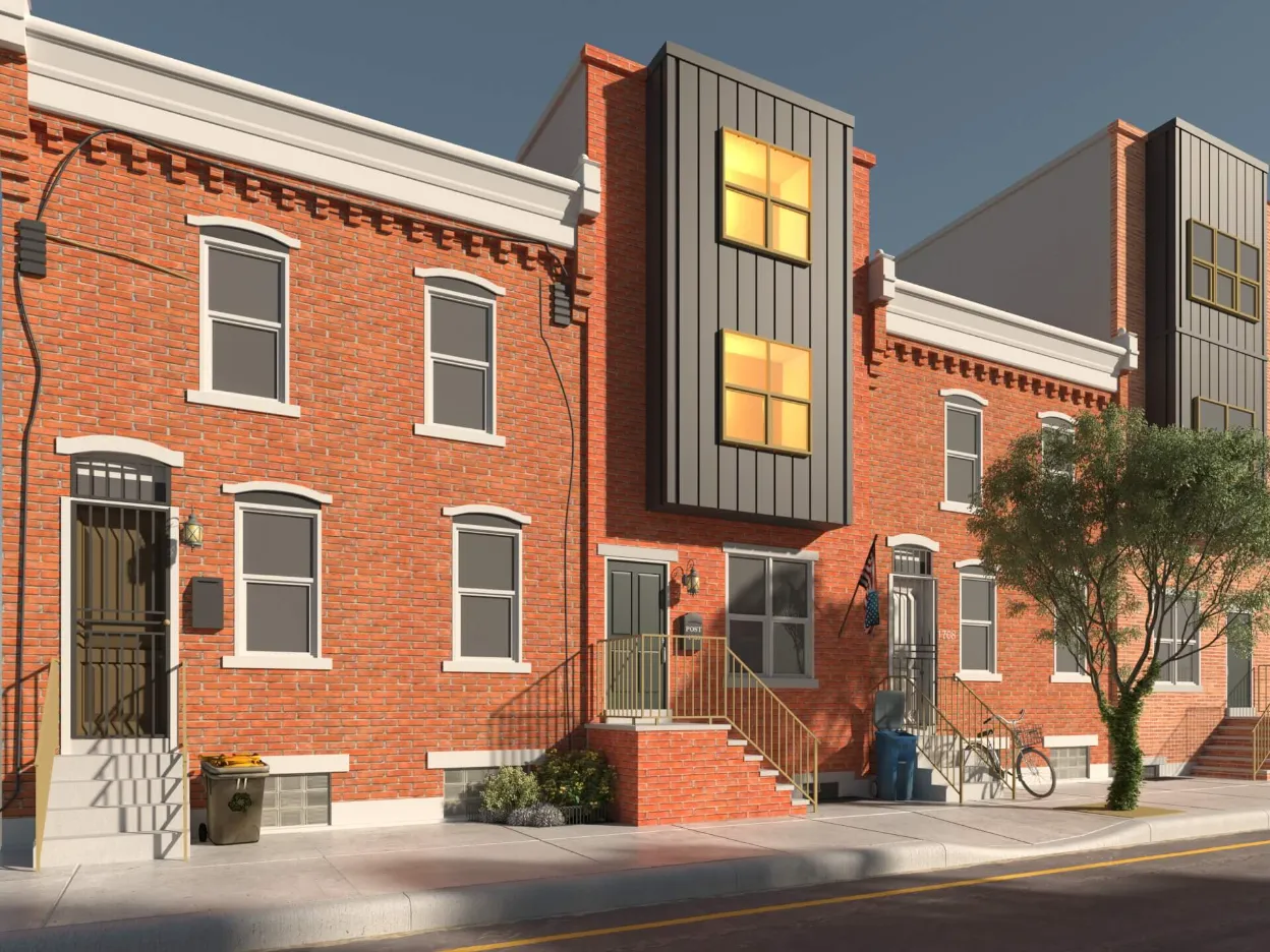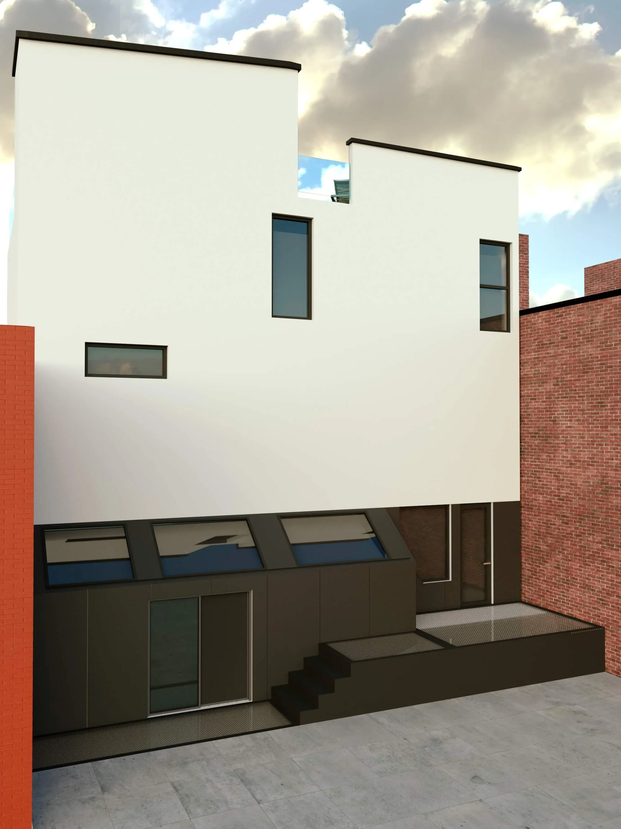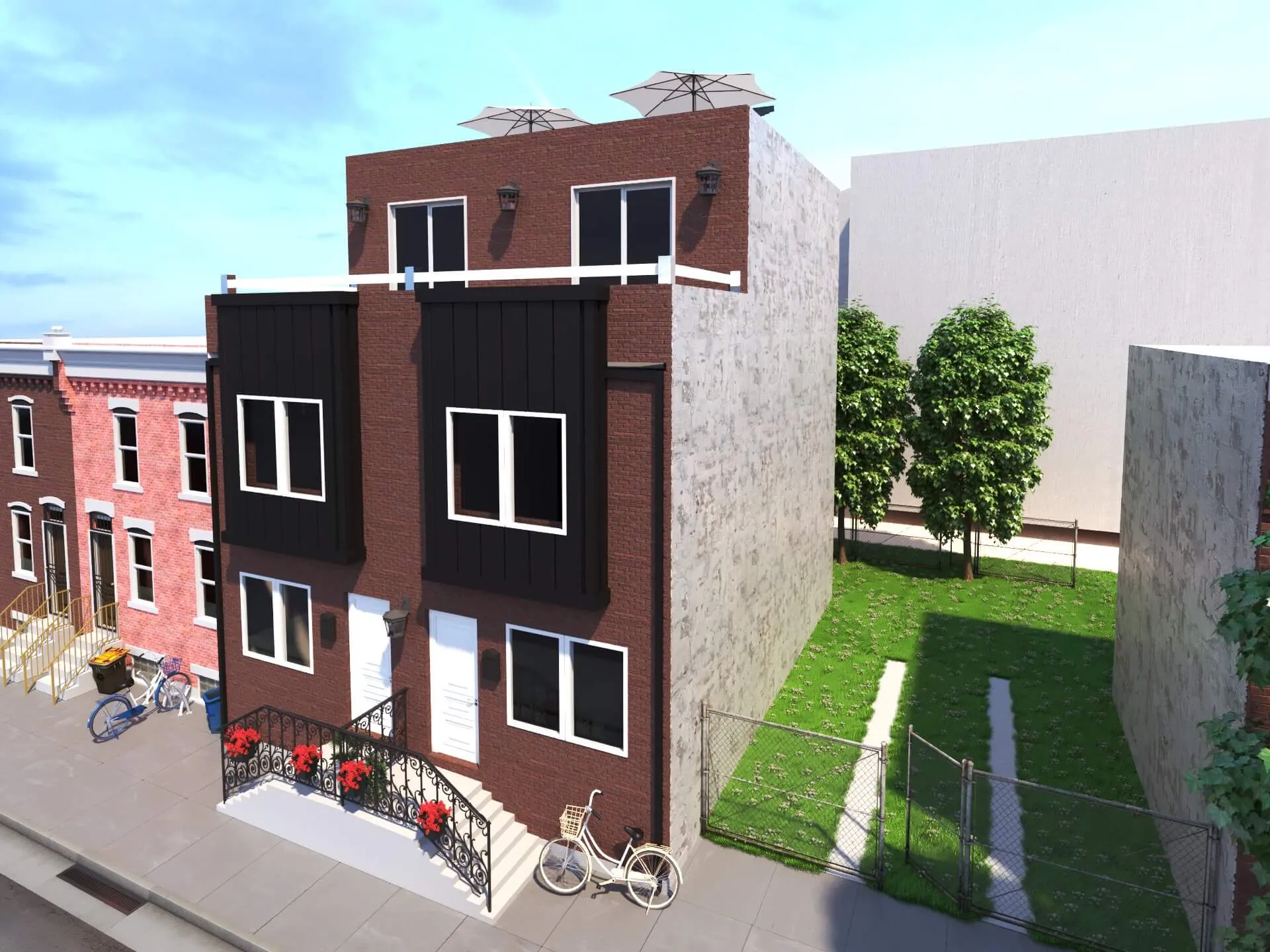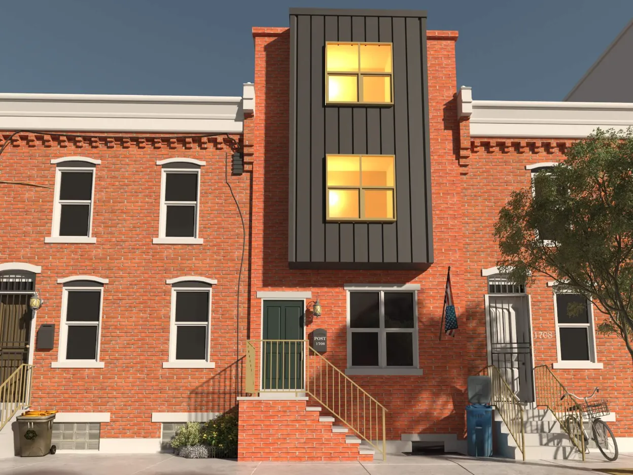 Stylish urban residence combining traditional brick textures with modern metal forms. Expansive roof deck and airy interiors maximize comfort in a compact footprint.