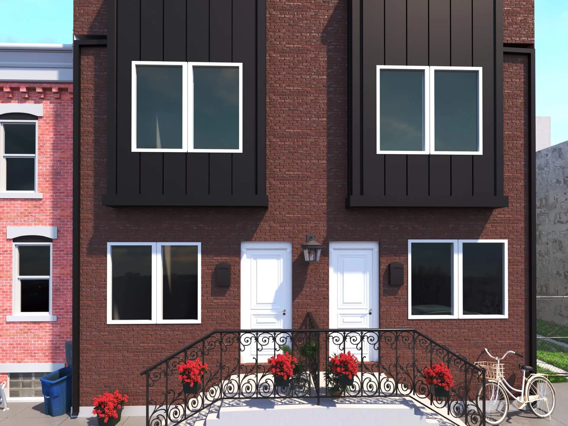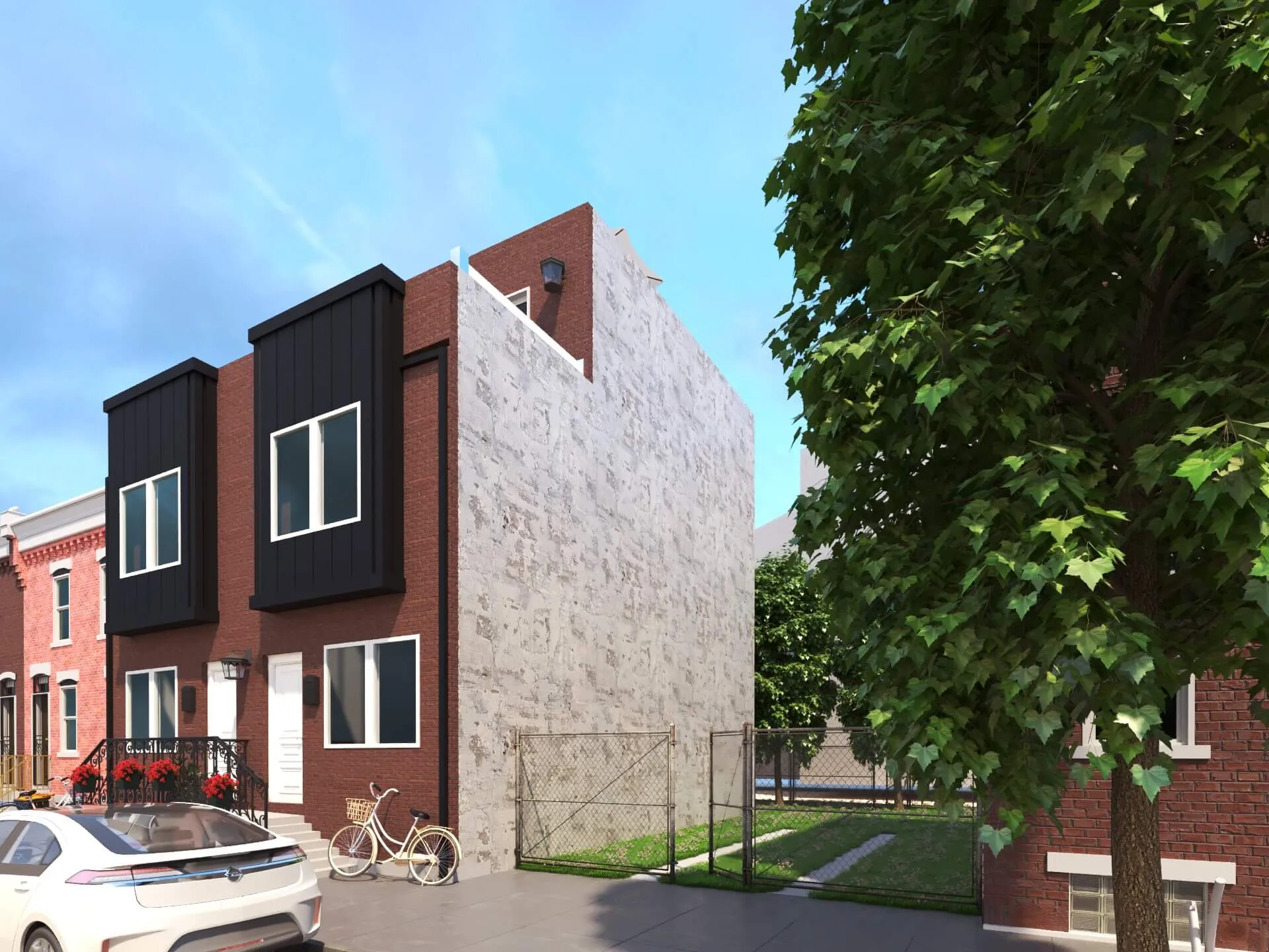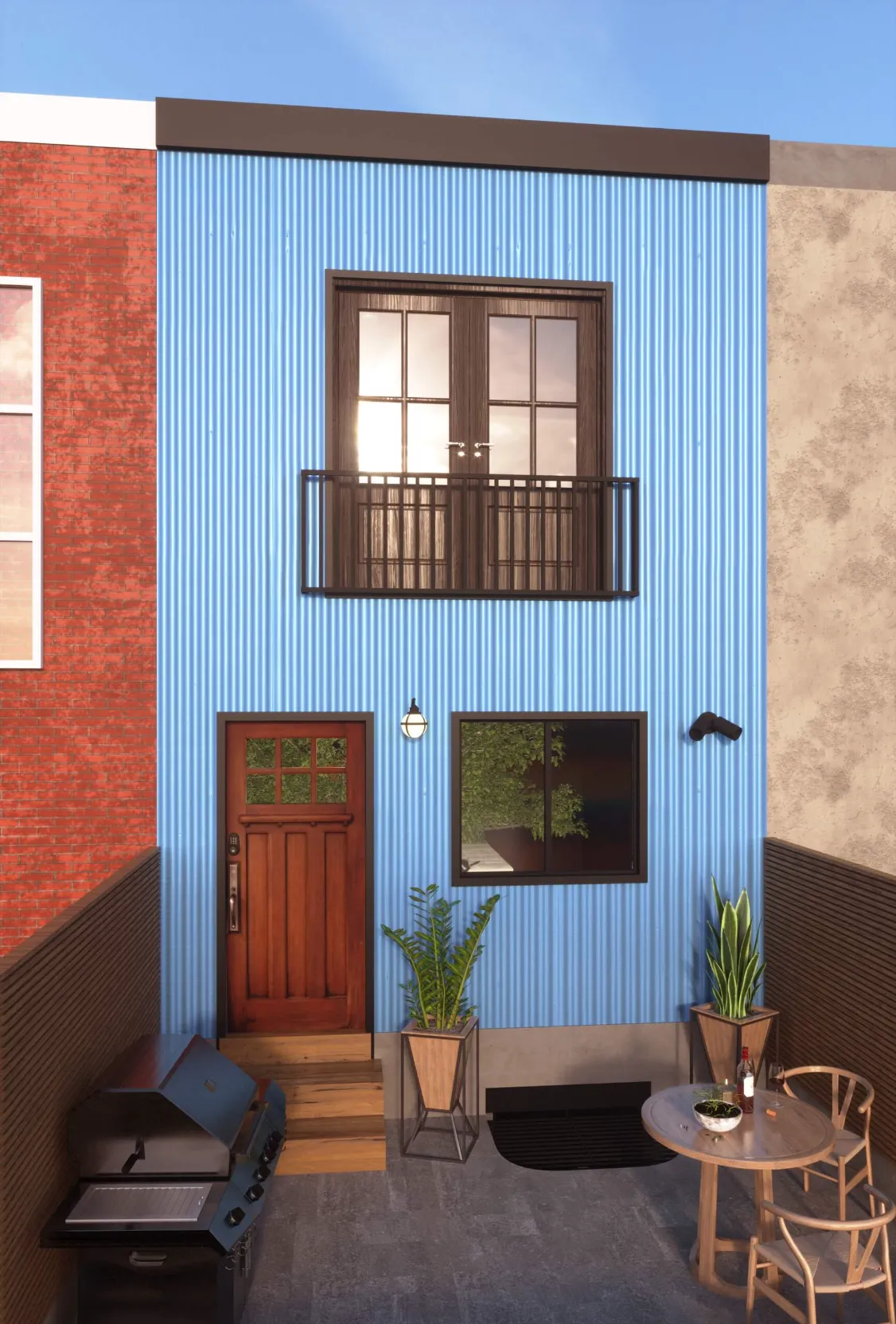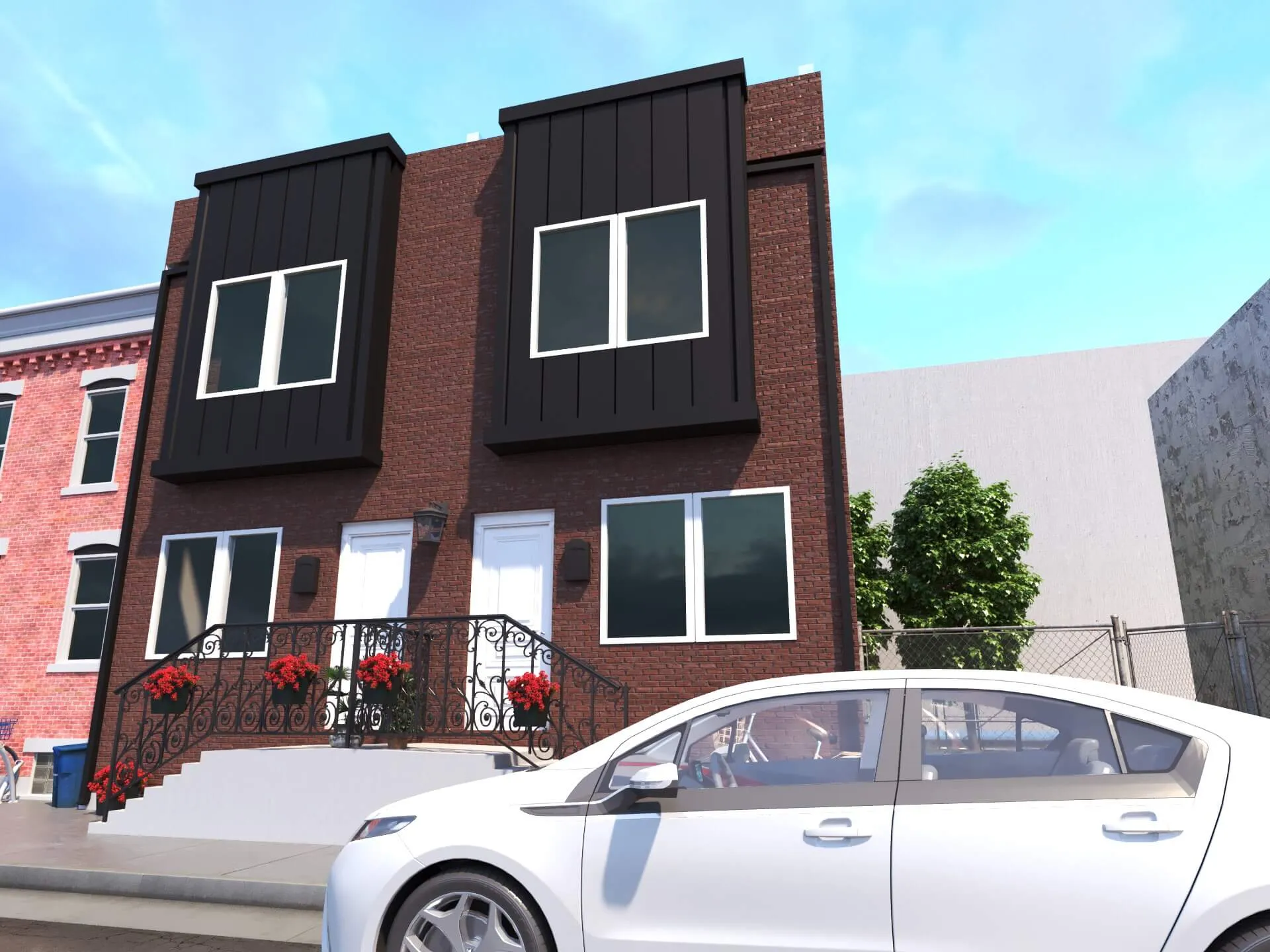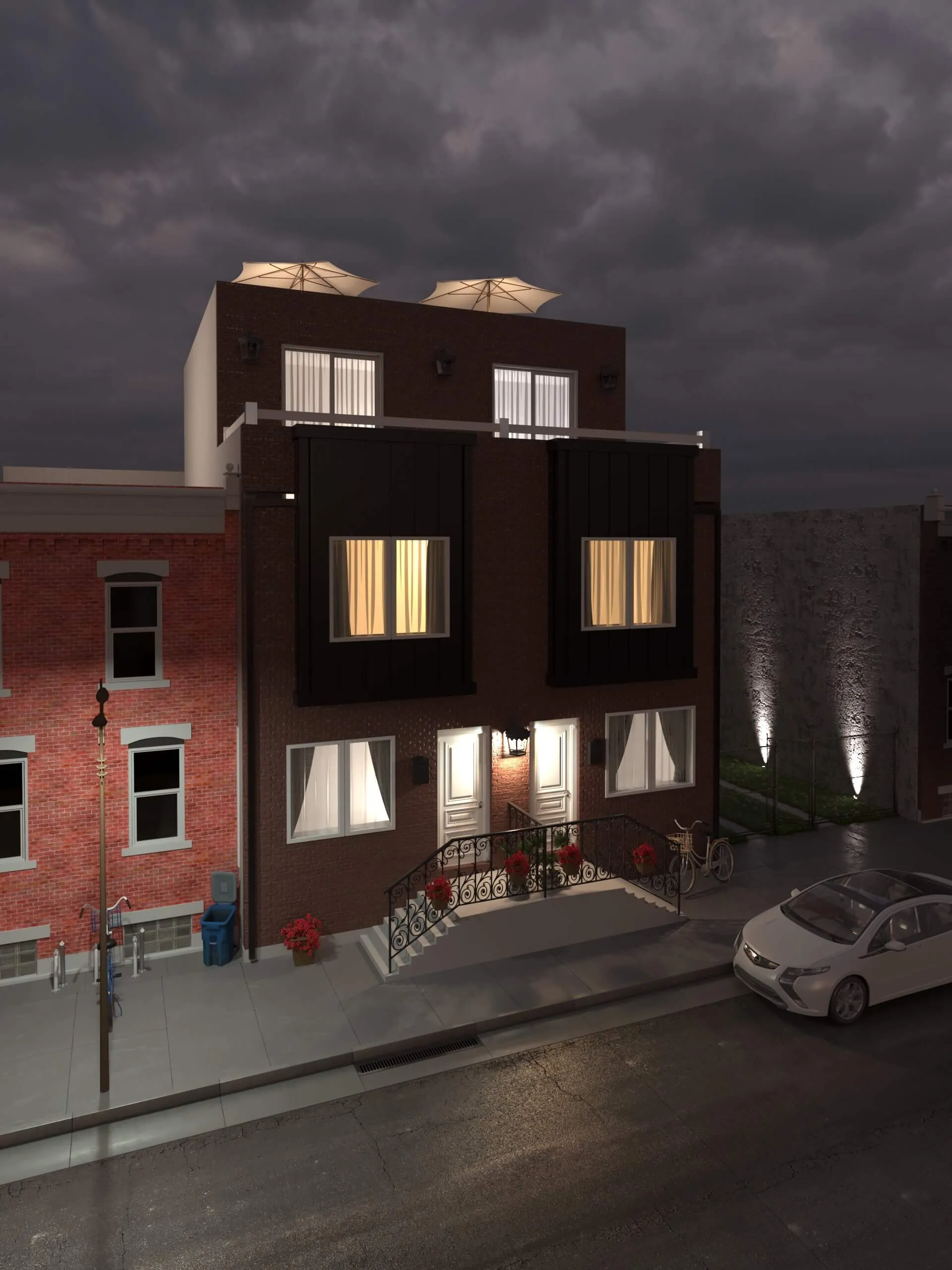Stylish urban residence combining traditional brick textures with modern metal forms. Expansive roof deck and airy interiors maximize comfort in a compact footprint.