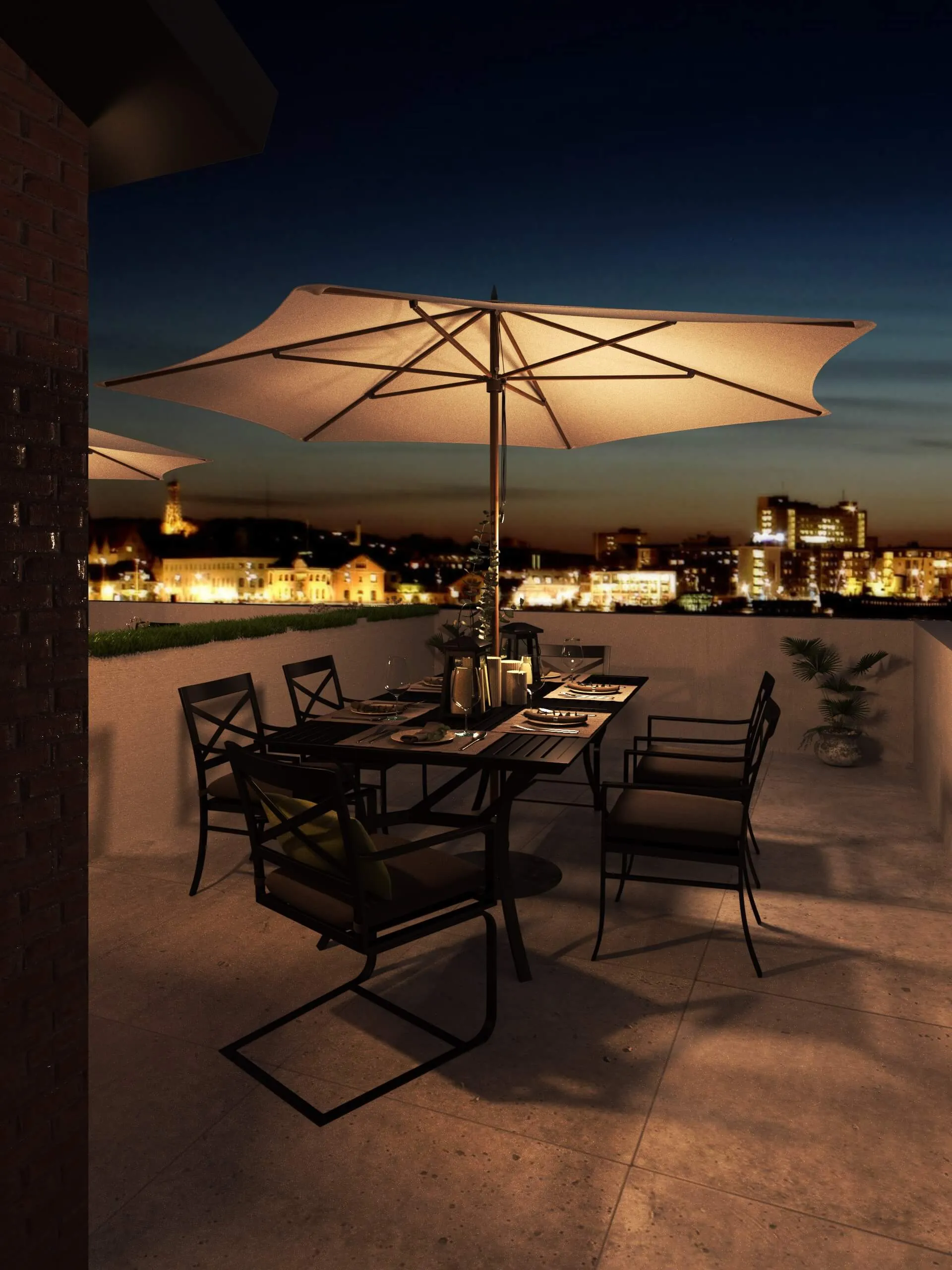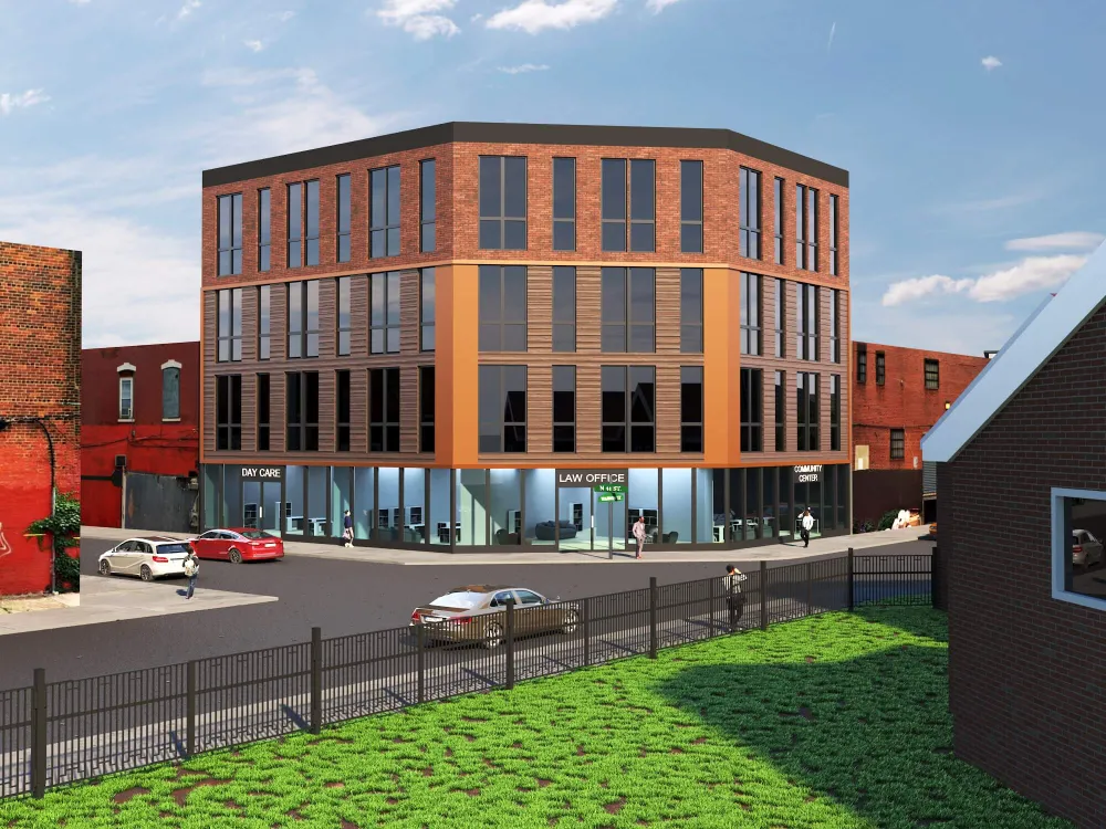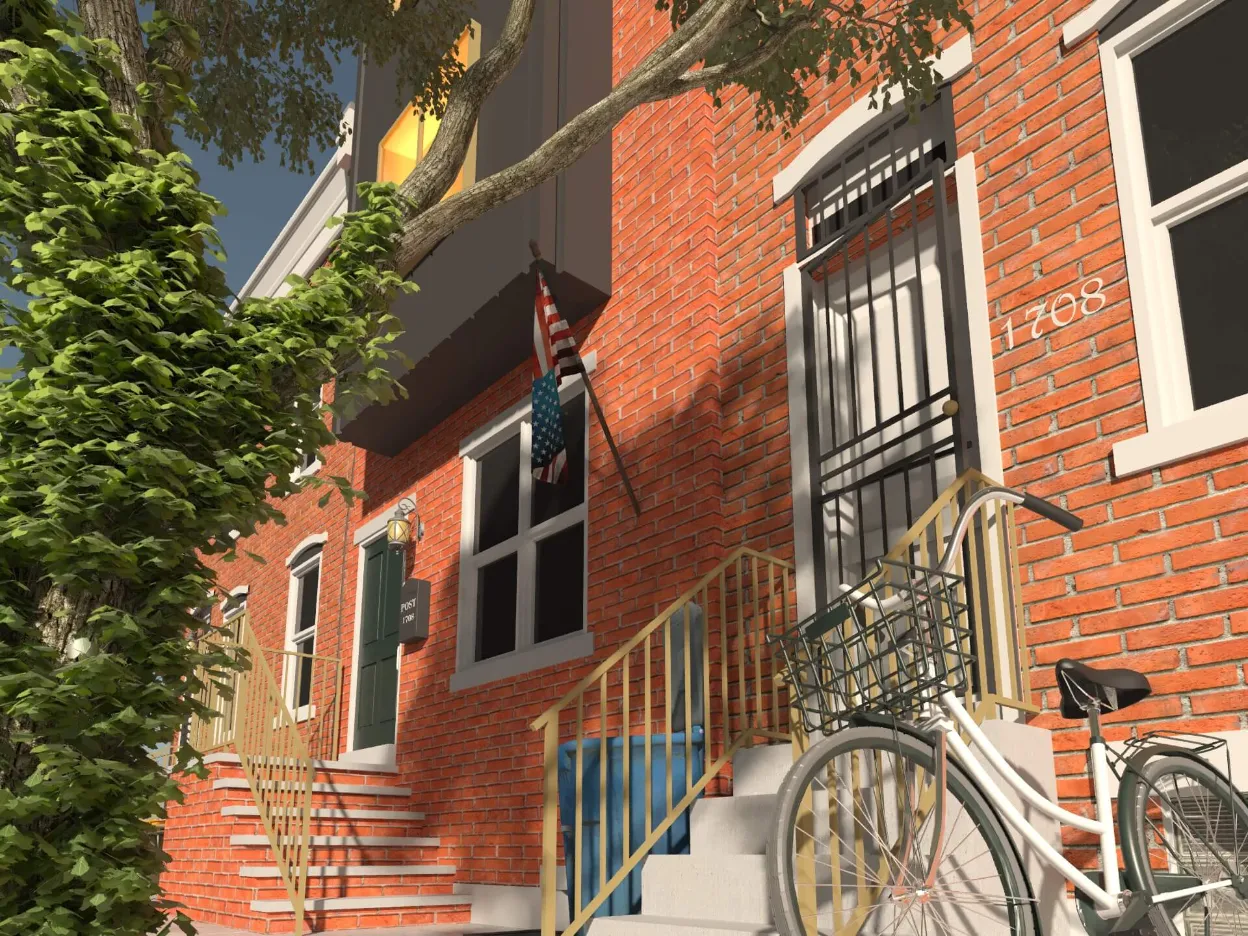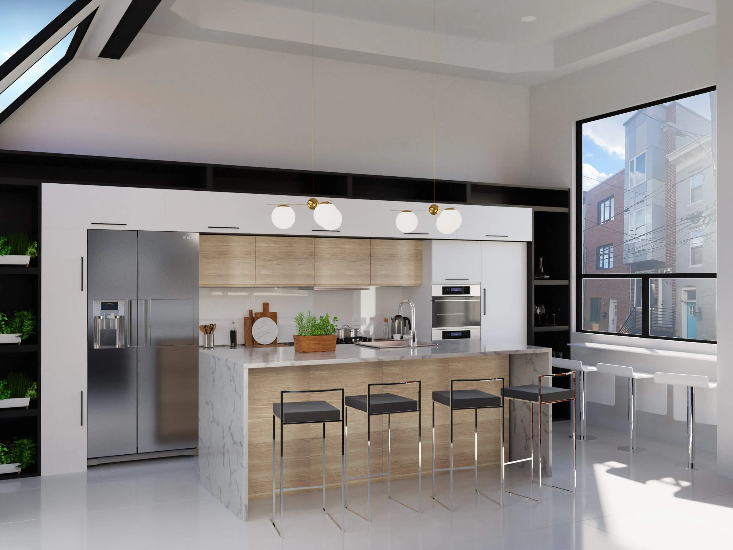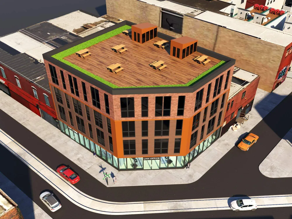 Stylish urban residence combining traditional brick textures with modern metal forms. Expansive roof deck and airy interiors maximize comfort in a compact footprint.