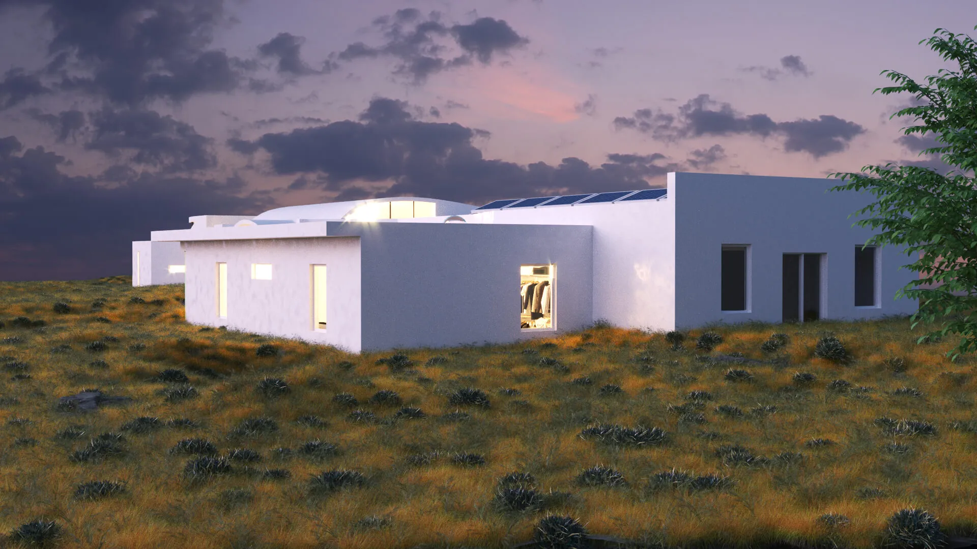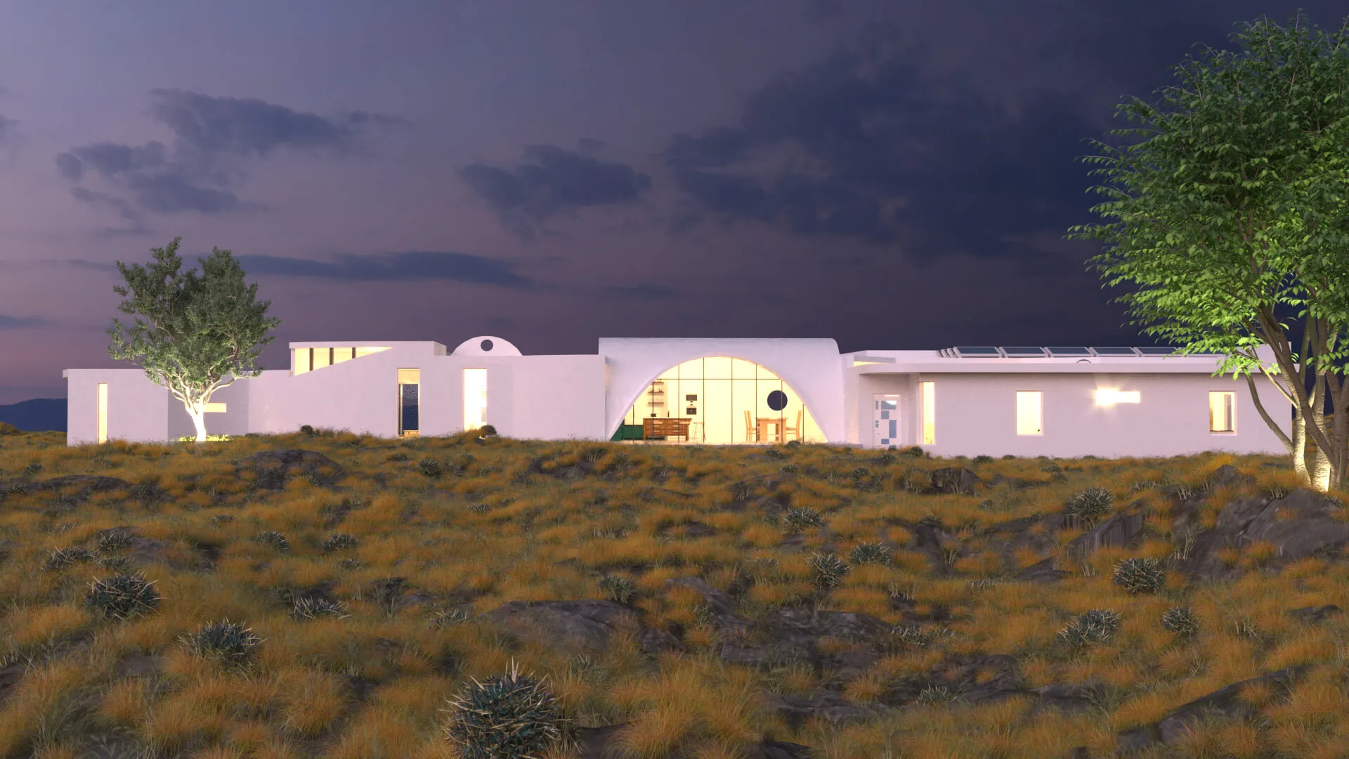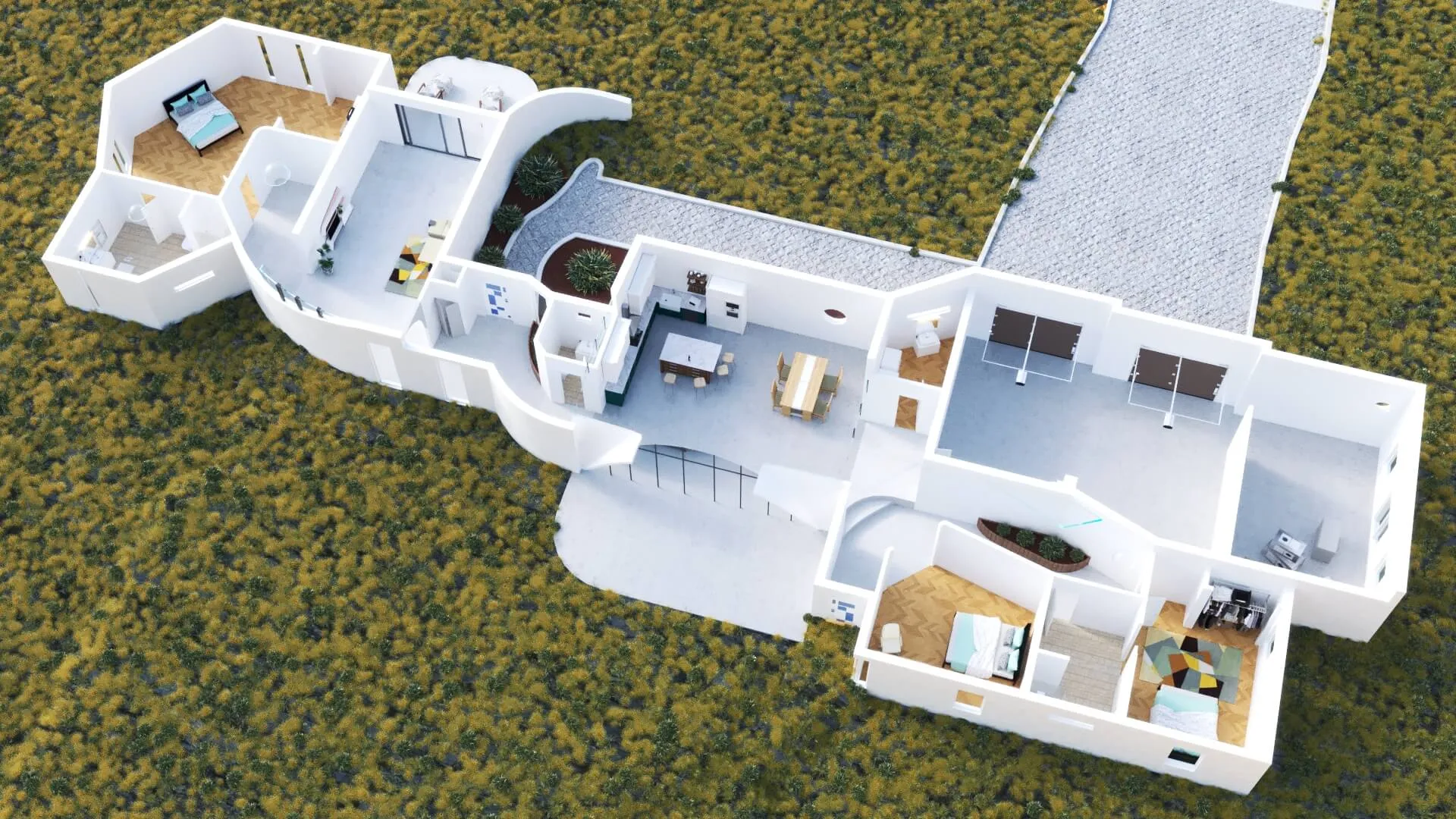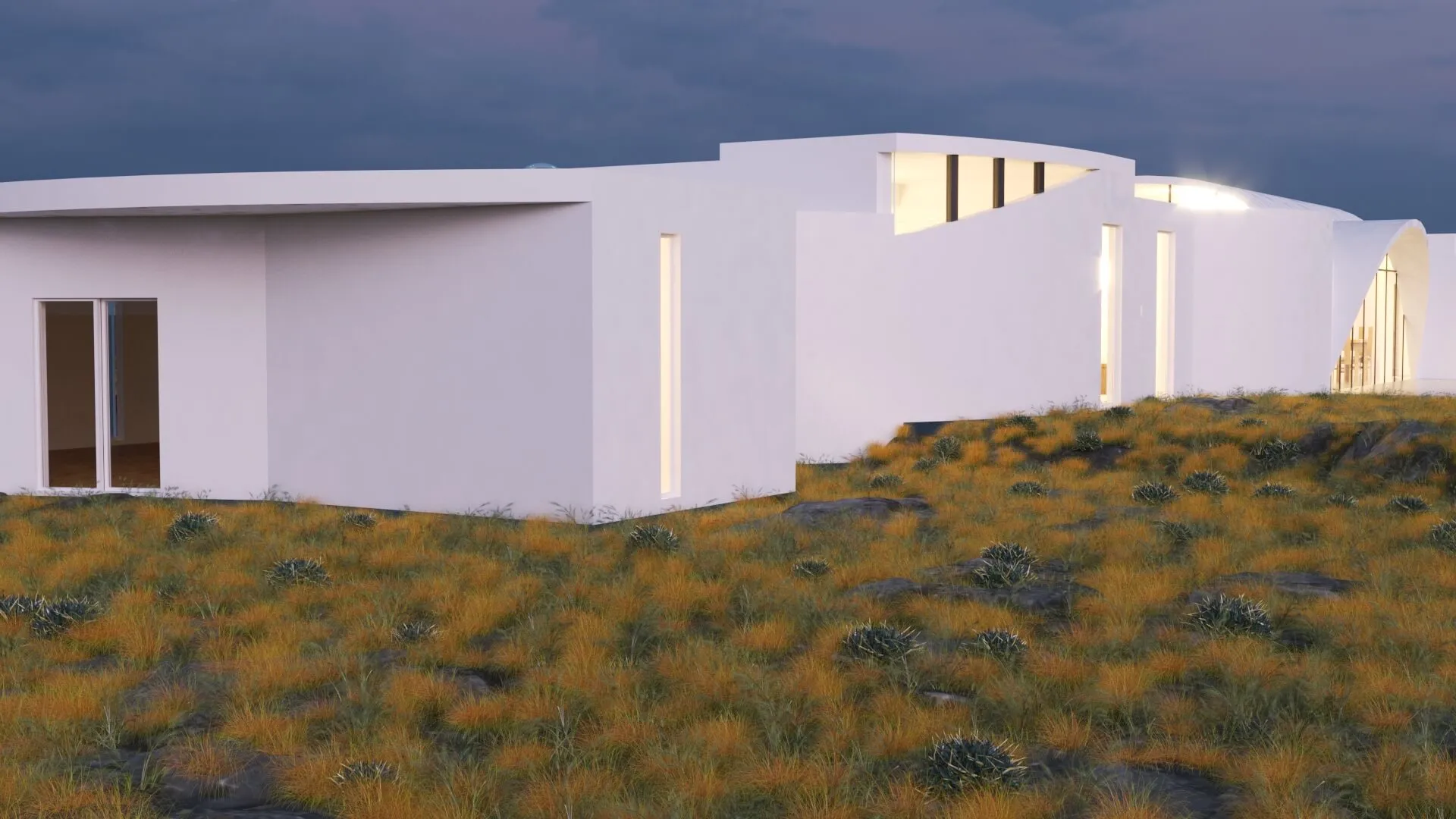 A modern single-story residence inspired by soft minimalism and natural landscapes. Clean white forms and curved transitions create a calm, sculptural aesthetic.