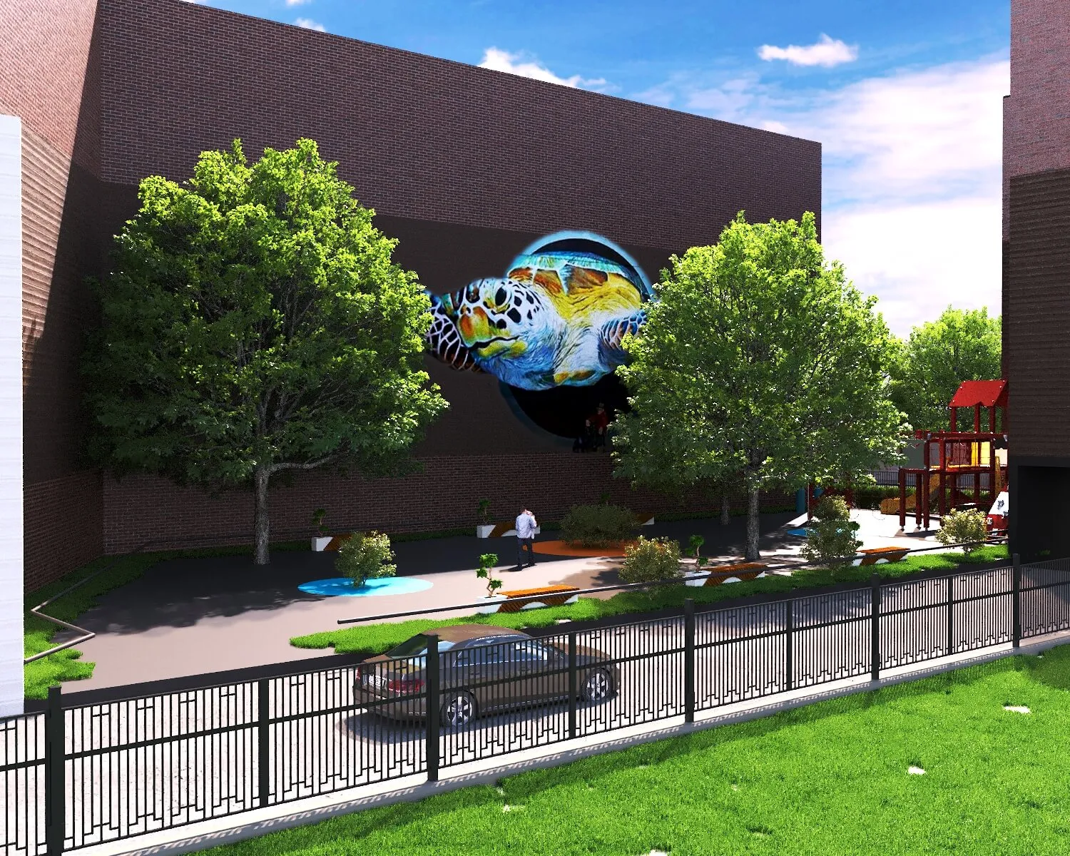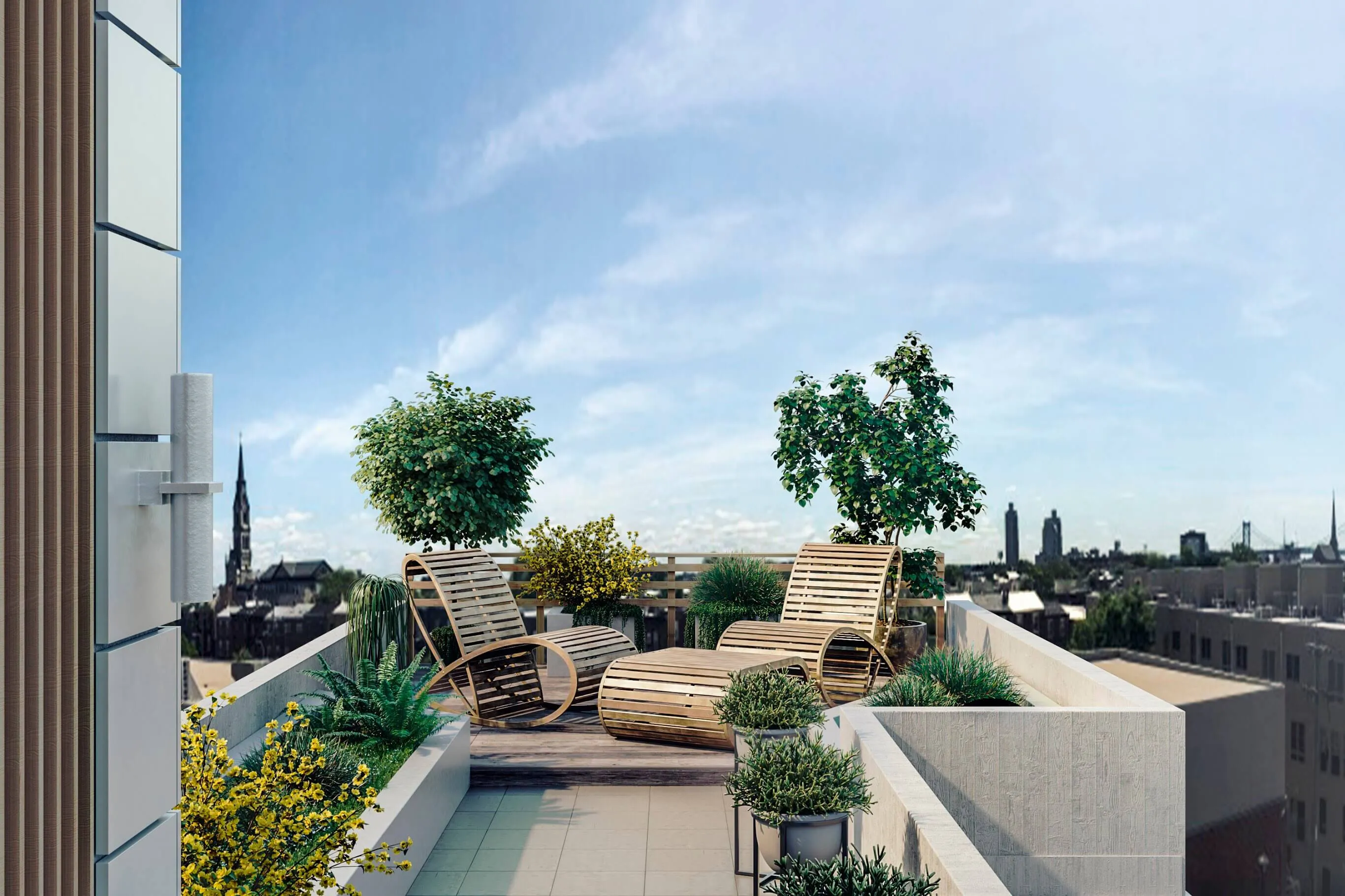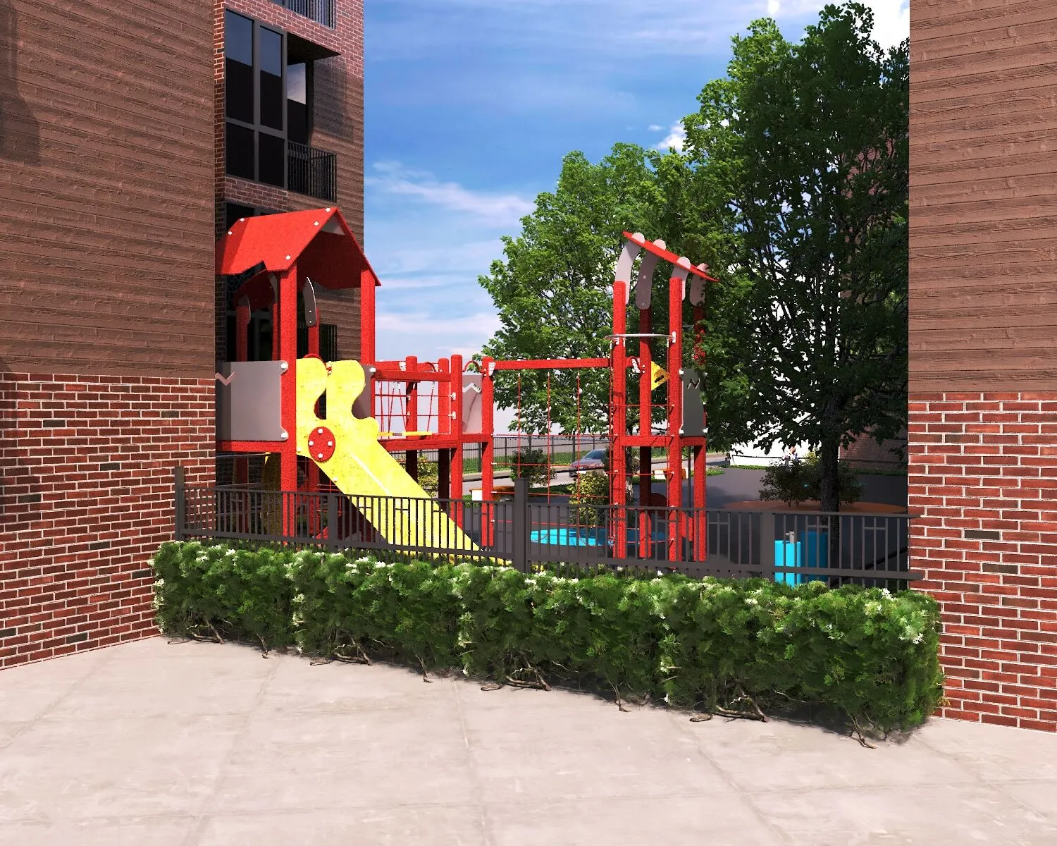 Contemporary apartment development with outdoor lounges, green spaces, and family-friendly amenities integrated into urban living.